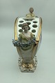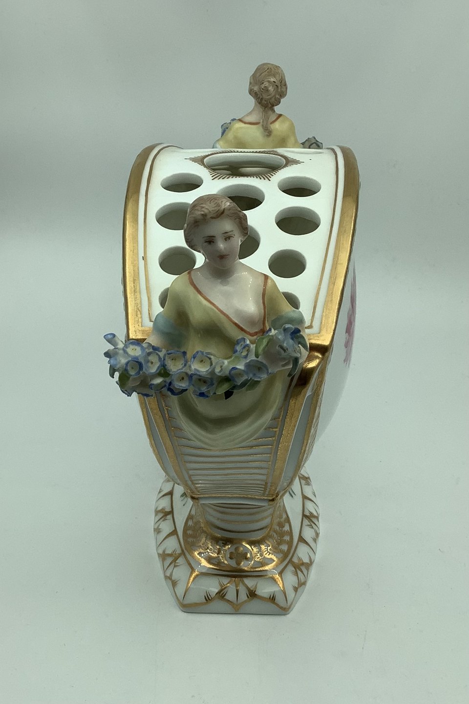 Decorated in colour and gold with flowers, handles shaped as figurines holding flower festoon H.18 cm./ 7.08 inches