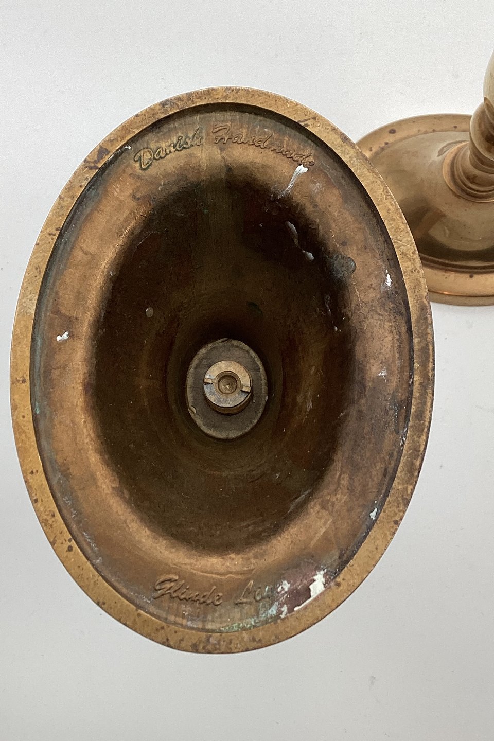 Pair of brass candlesticks. Produced in Denmark c. 1950. In good condition. At the bottom marked: Danish Handmade "Glinde Line". H. 19 cm (7.48 inches)