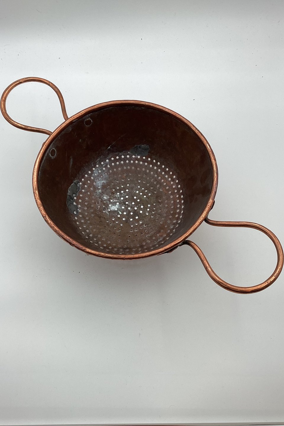 Antique copper colander with two handles. Made in Denmark approx. 1860. I god stand. However, has a few repairs (see photos). Measurements: 11 cm (4.33 inches) high 41 cm (16.14 inches) long.
