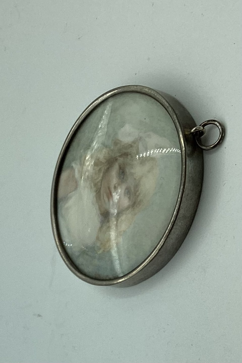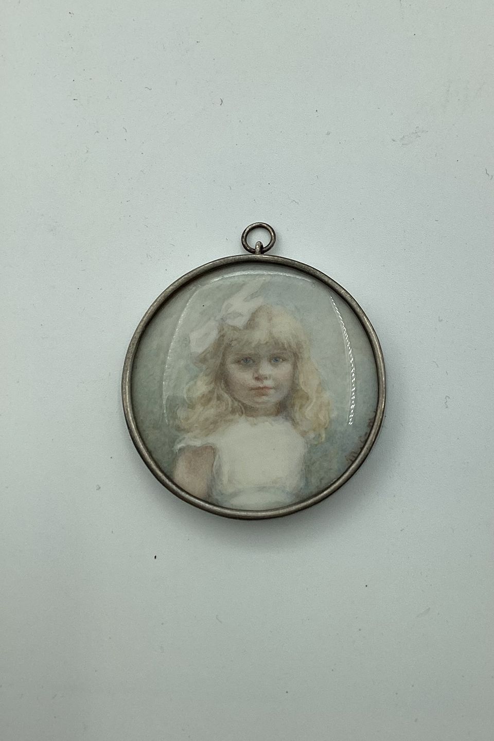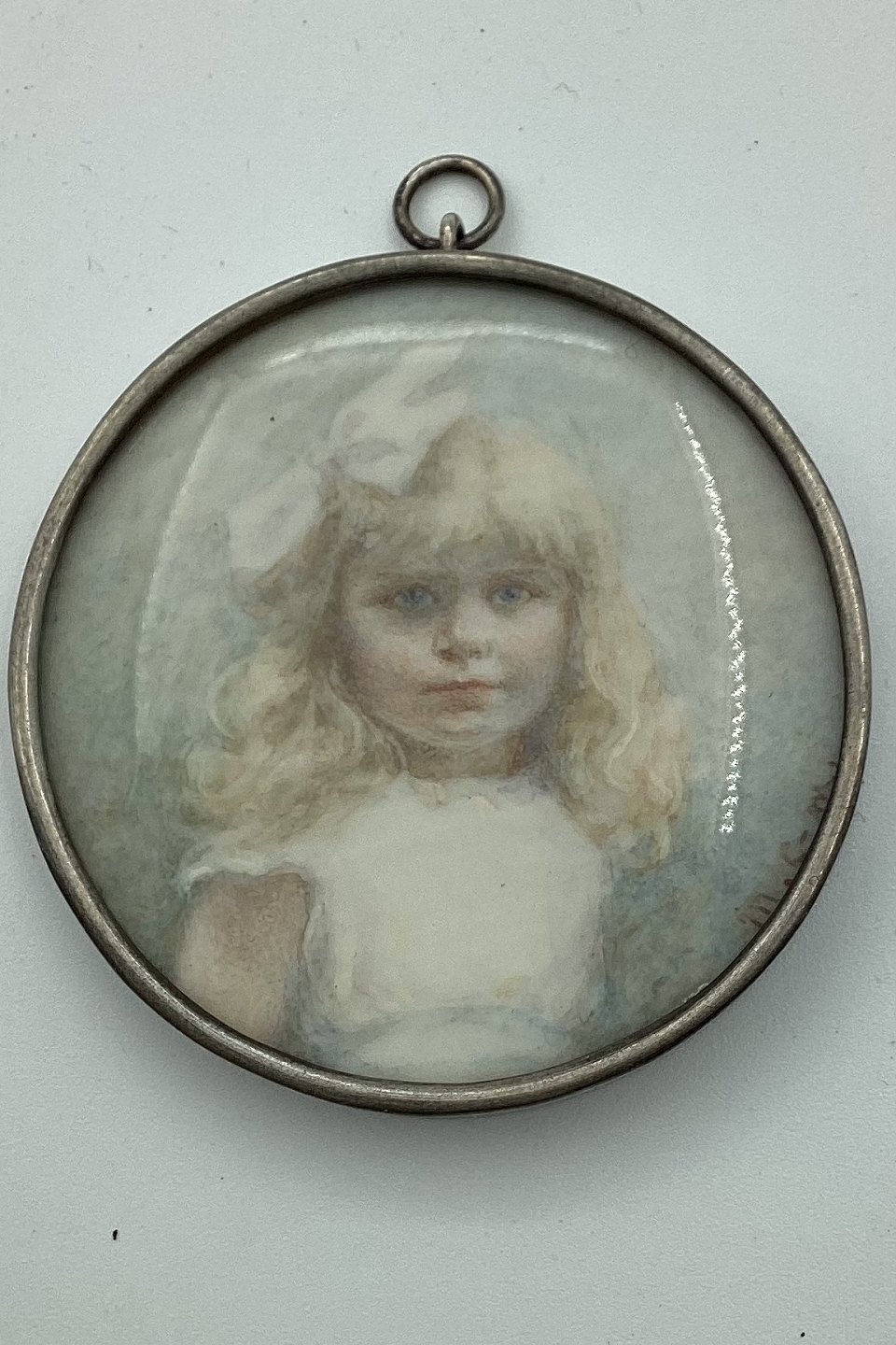 Watercolor miniature portrait of blonde girl with bow in hair from c. 1900. Inserted in metal frame with glass. Signed by unknown artist at bottom right. In good condition. Dimensions: 5 cm in diameter (1.96 inches)