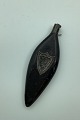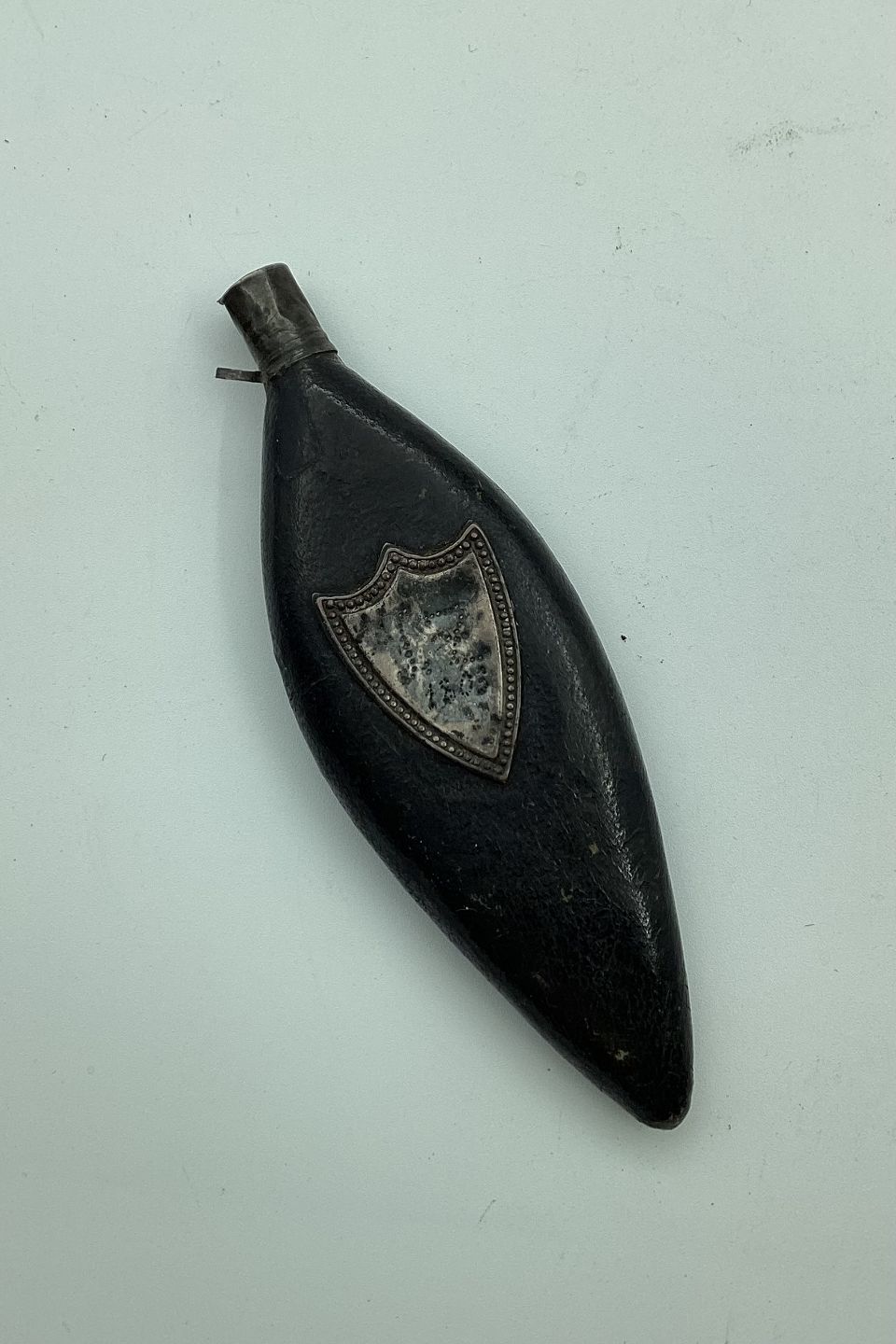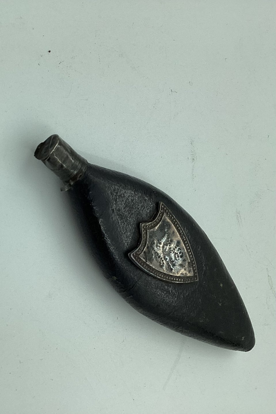 Leaf-shaped leather-covered perfume bottle 1803. Shields of silver on each side. Owner initials and the year 1803. In good condition. Length 11 cm (4.33 inches)
