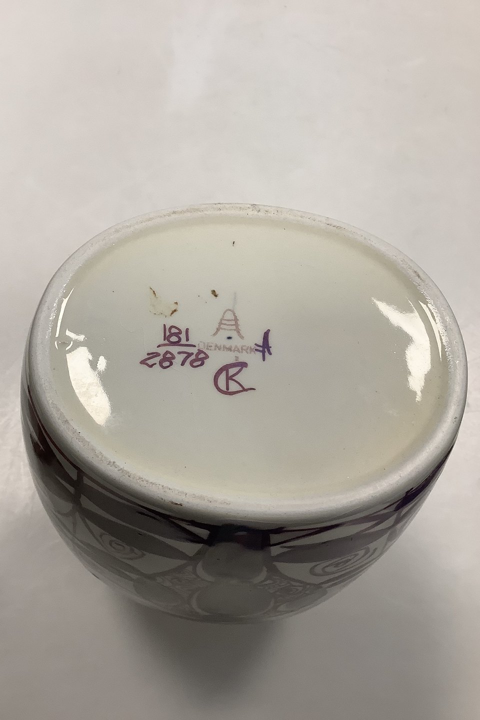 Aluminia / Royal Copenhagen Tenera Vase No. 181 / 2878 with purple floral motif. Designed by Kari Christensen