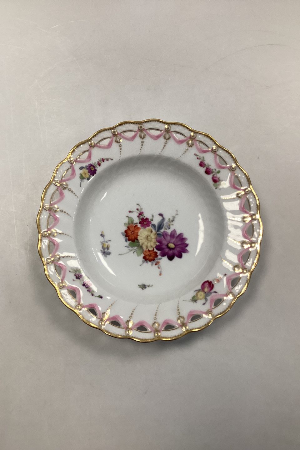 Royal Copenhagen Full Saxon Flower Deep Plate with Pierced Lace Border from 1860-1890. 22.5 cm dia (8 55/64"). In nice condition, with No to minimal wear on the gold.