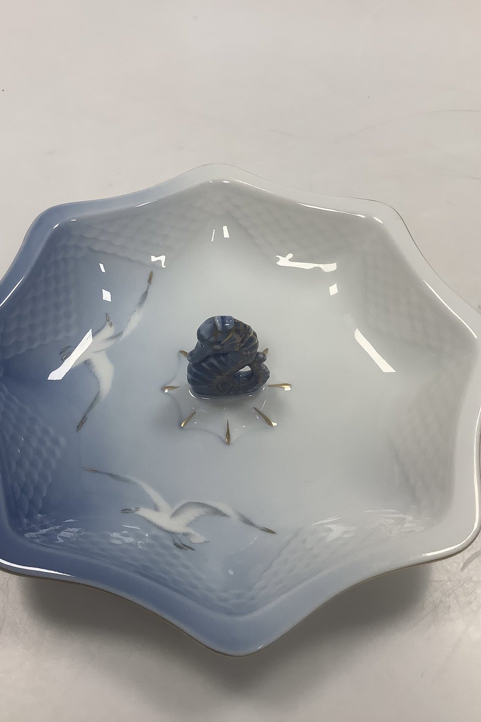 Bing and Grondahl Seagull with Gold Octogonal Dish with Seahorse No 21. Measures 21 cm / 8 17/64 inch