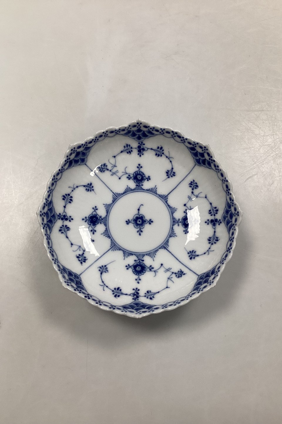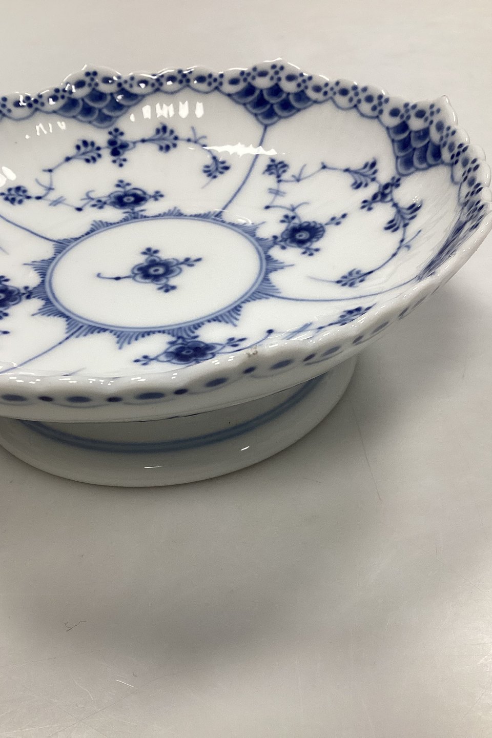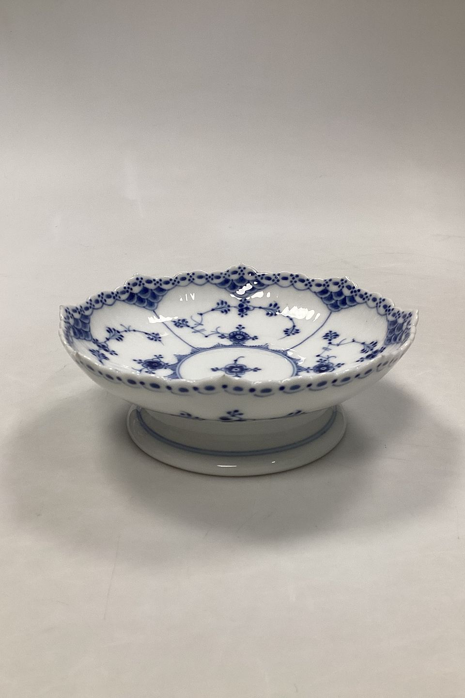 Royal Copenhagen Blue Fluted Half Lace Bowl on foot no 511. Measures 17.5 cm / 6 57/64 in. Has 2 chip on the edge, see pictures