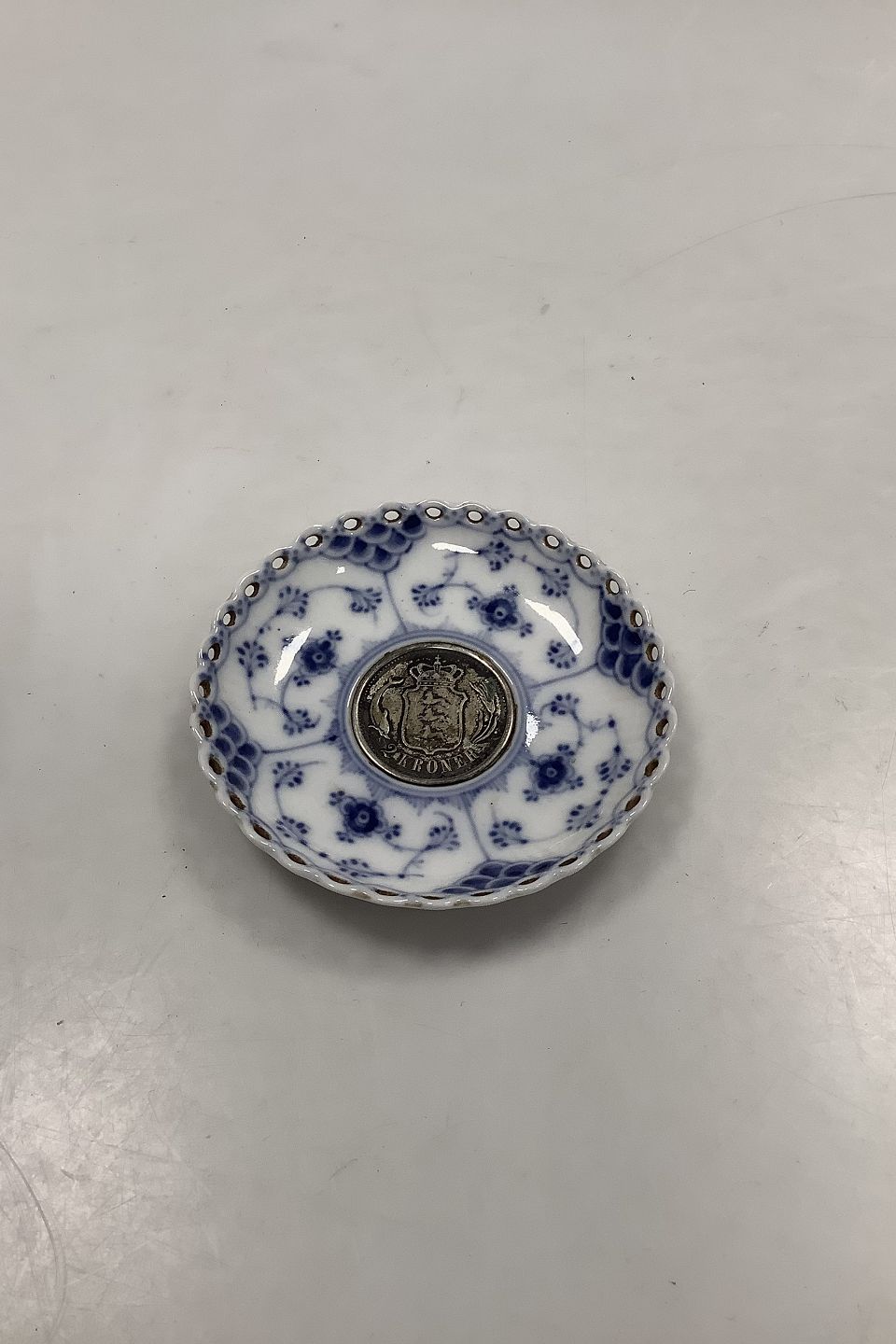 Royal Copenhagen Blue Fluted Full Lace Candle Drip Cup with mounted 2-Crown coin. No 1009.