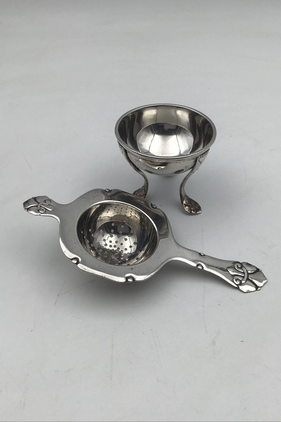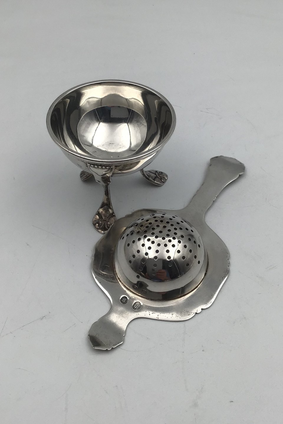 Cohr Silver Fransk Lilje (French Lily) Tea strainer and stand Measures L Tea Strainer 14 cm (5.51 inch) Stand H 5 cm (1.96 inch) Combined Weight 78.8 gr (2.78 oz)