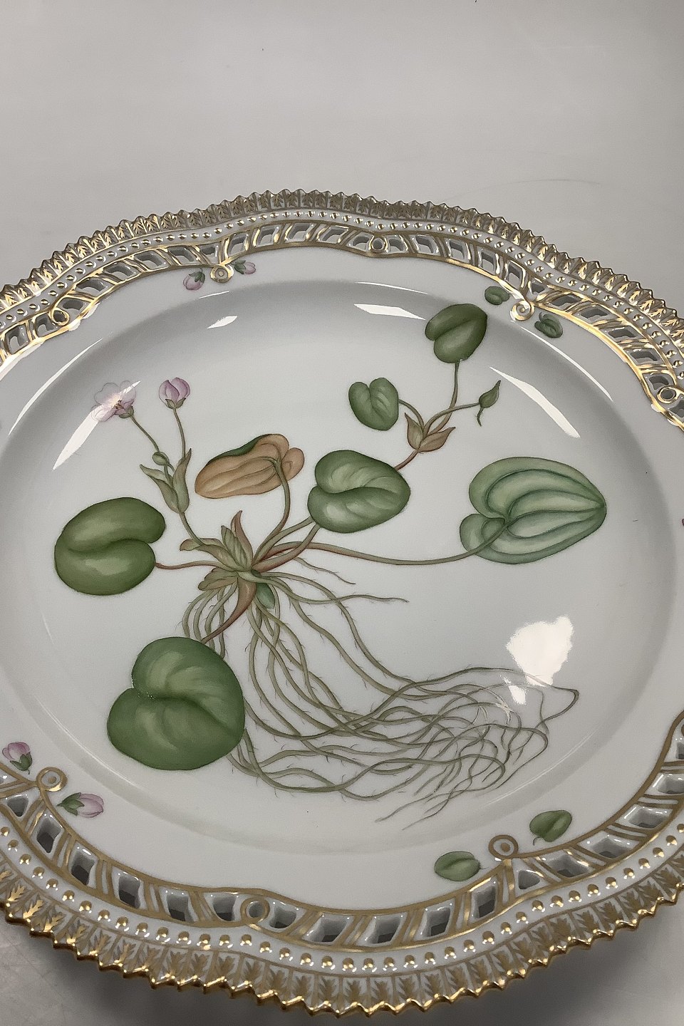Royal Copenhagen Flora Danica Charger plate with pierced border No 20 / 3574 or 381. Measures 28 cm / 11 1/32 in. Latin name: Hydrochaus Morsus ranae L
