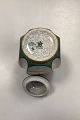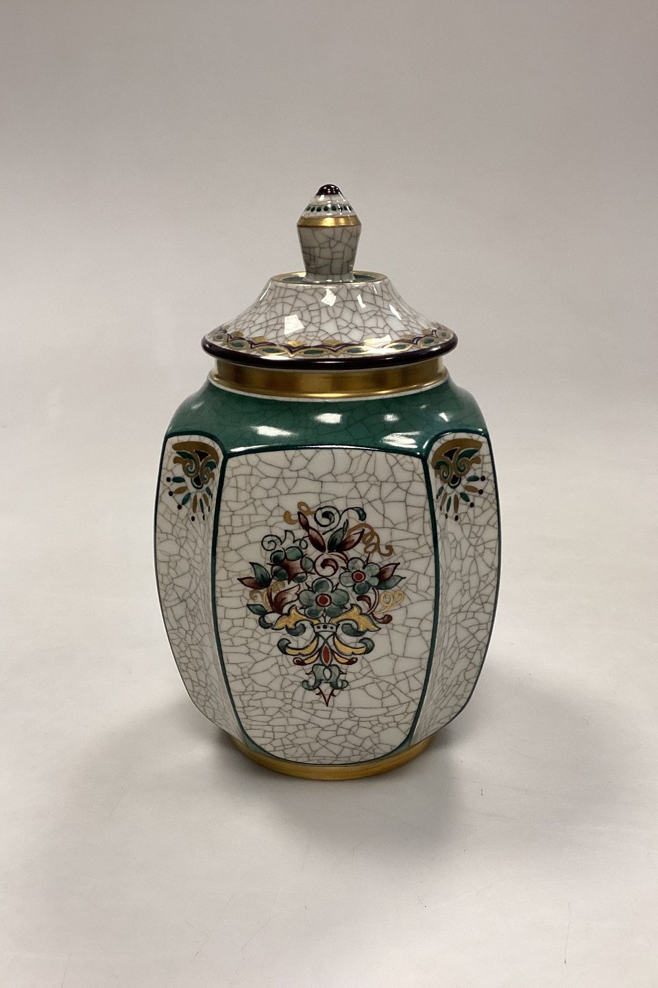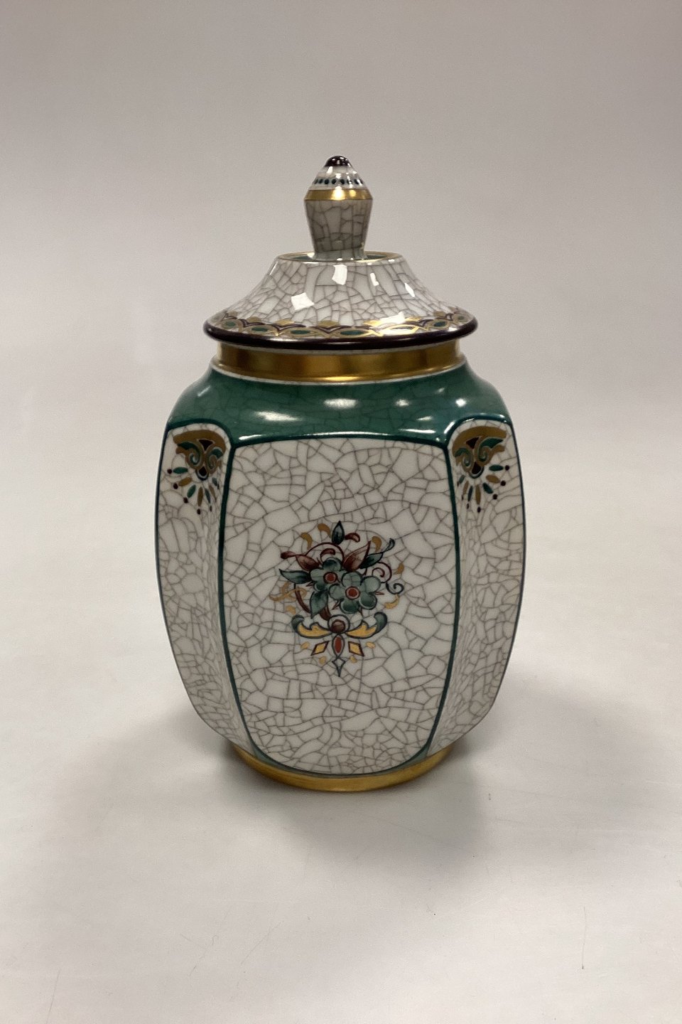 Dahl Jensen Cracked Lidded Jar No. 196/600. Decoration in green, white red and gold. 1st Quality. Measures 19 cm / 7.48 in.