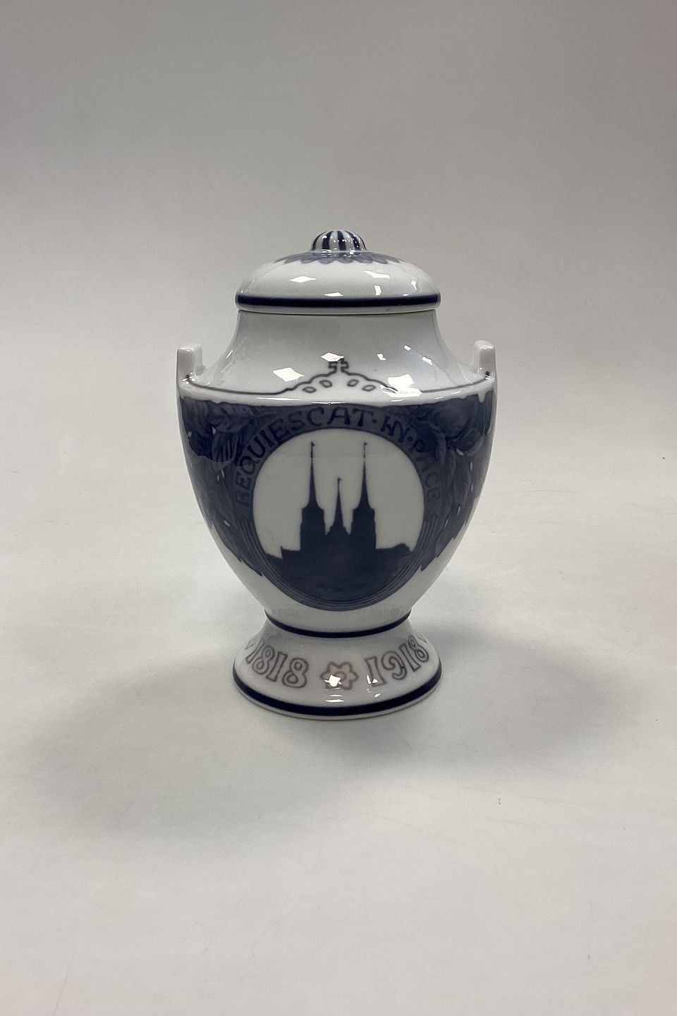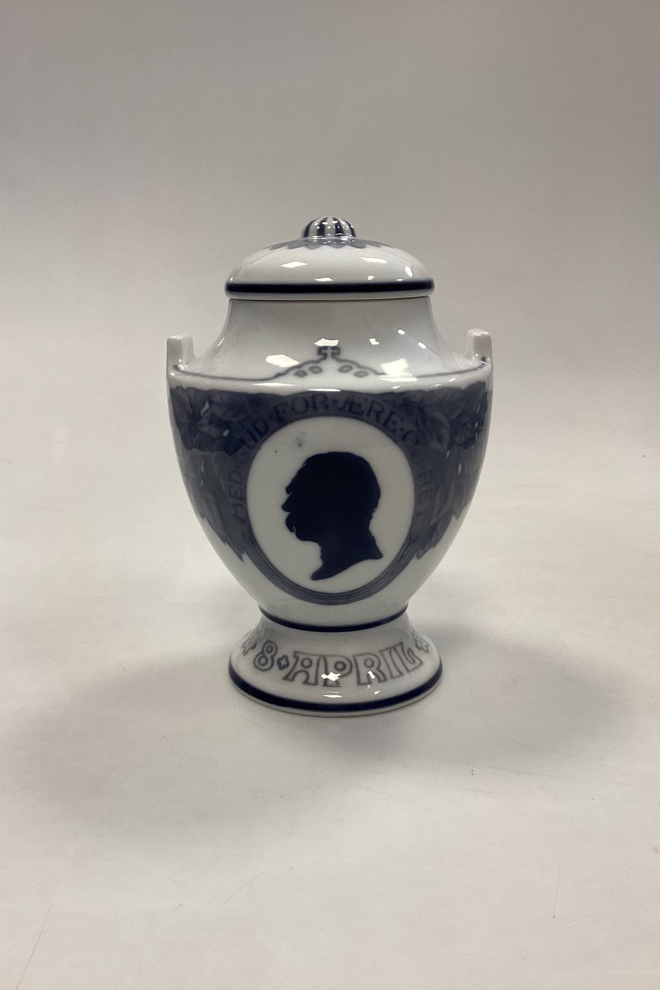 Royal Copenhagen Vase with Lid 8th of April 1818-1918. On the occasion of the 100th anniversary of the birth of Christian IX. Measures 17.5 cm / 6.88 in. 2nd Quality with glaze fault above the king's head.