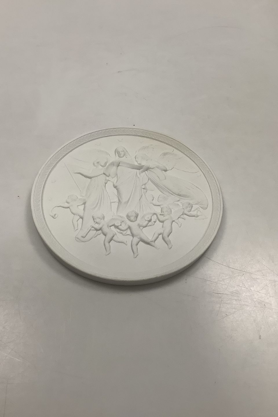 Royal Copenhagen Bisque Plate Christmas Joy in Heaven No 111. Copy from 1843 by N.G.Henriksen after Thorvaldsens original from Rom 1836. Measures 15,3cm.
