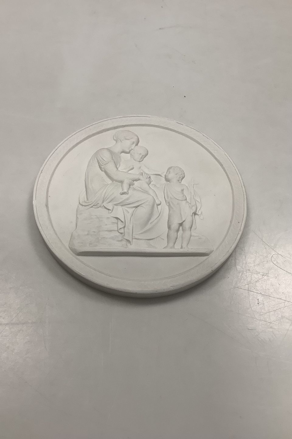 Royal Copenhagen Bisque Plate "Maria with Jesus and Johannes" No 120. Copy from 1841 after Thorvaldsen relief in Rom 1806. Measures 13,5cm (5.31 inch). Small chip 9 o'clock