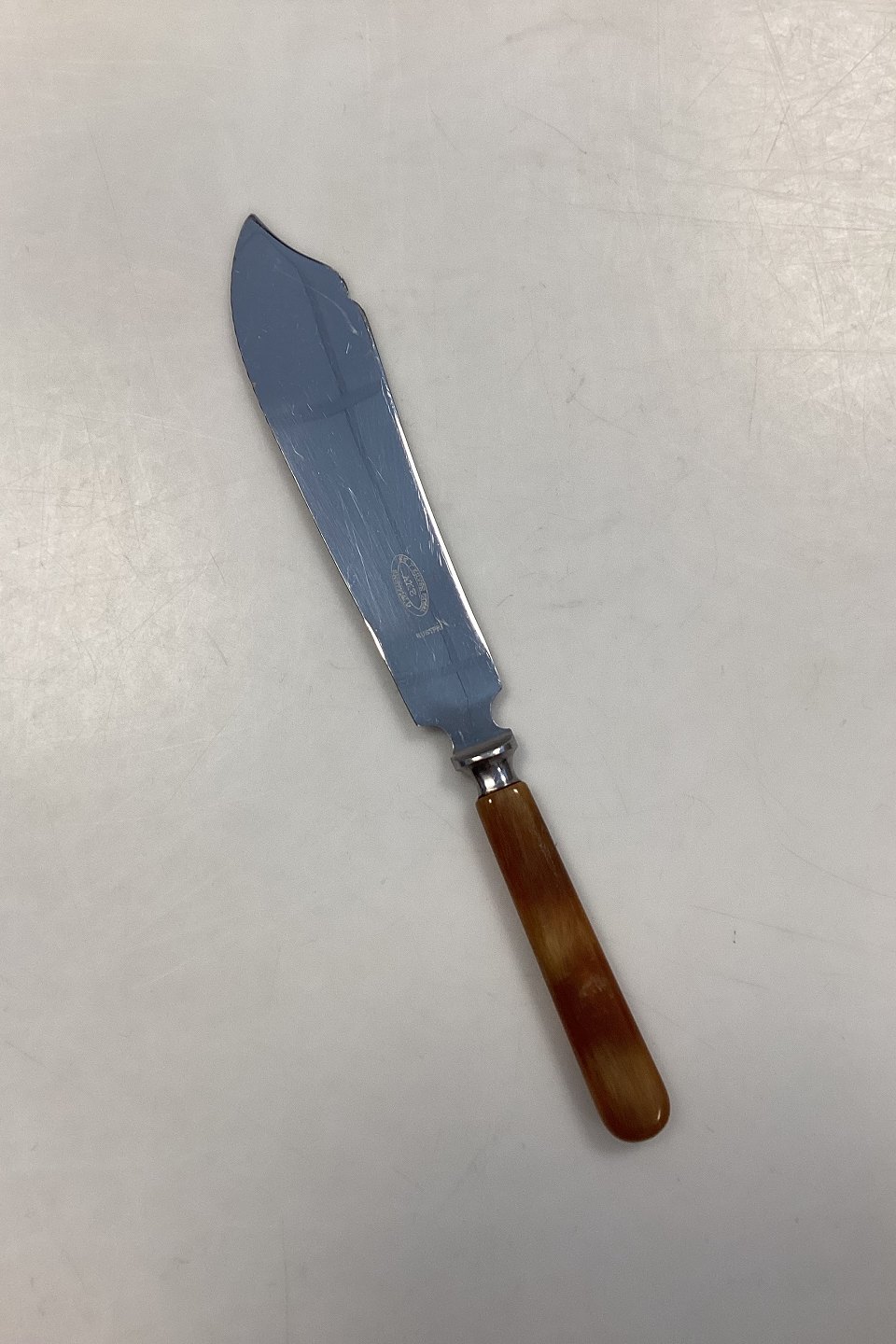 Stainless Sheffield Cake Knife with blade and amber bakelite handle. Measures 26.5 cm / 10.43 in. In very good condition.