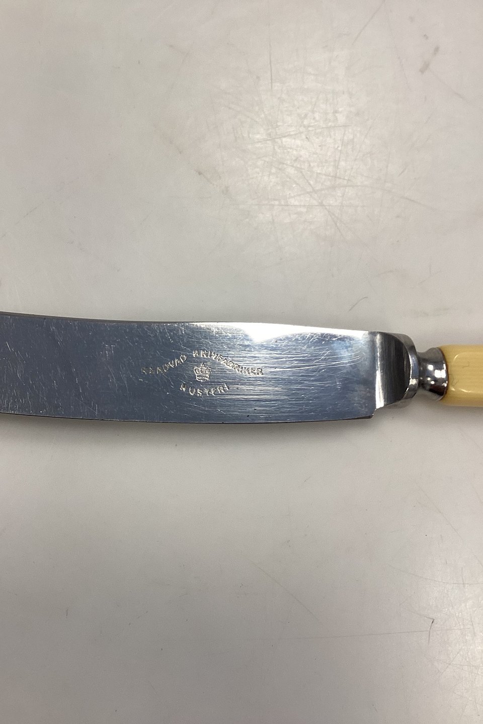 Raadvad Stainless Lunch Knife with yellowish plastic handle/artificial horn. In good condition.