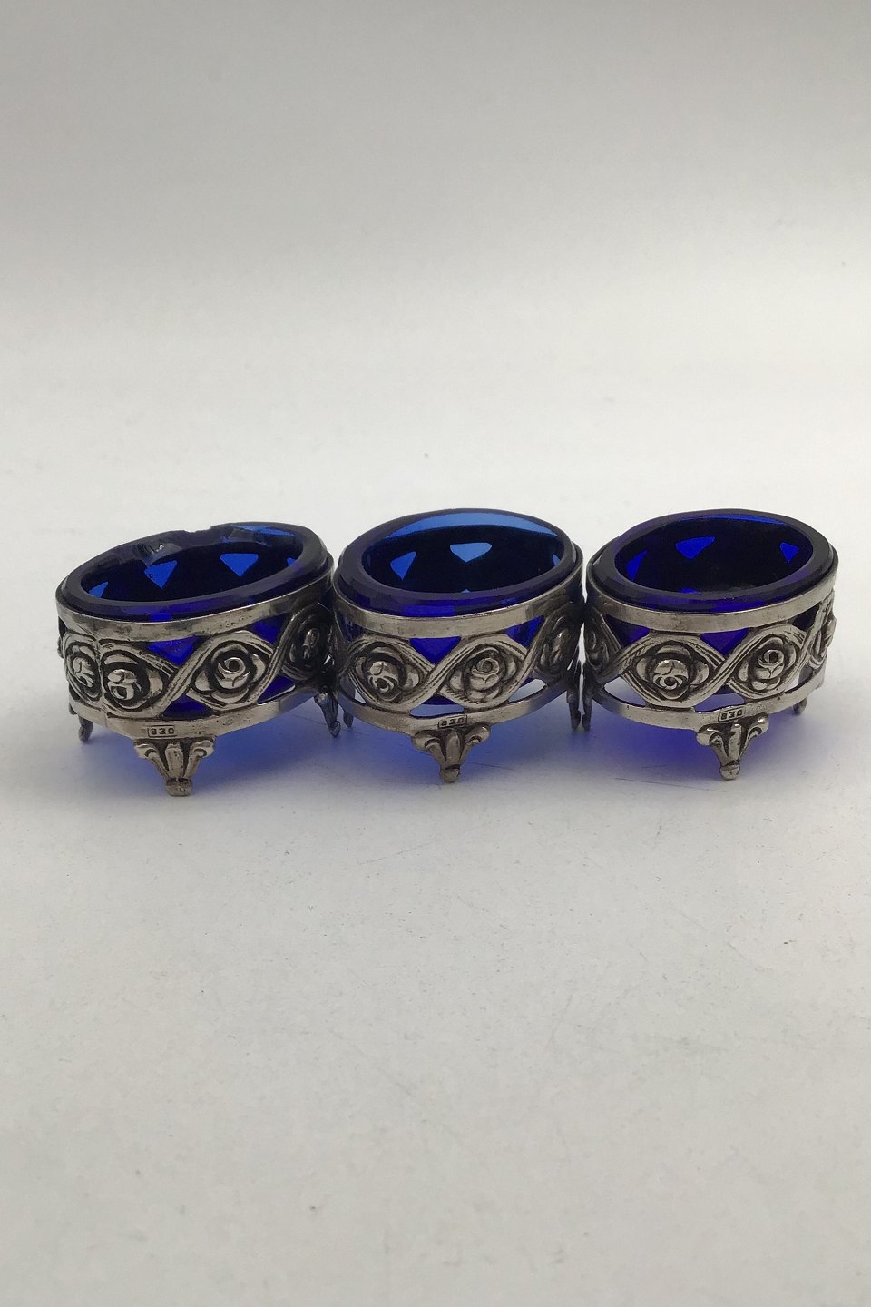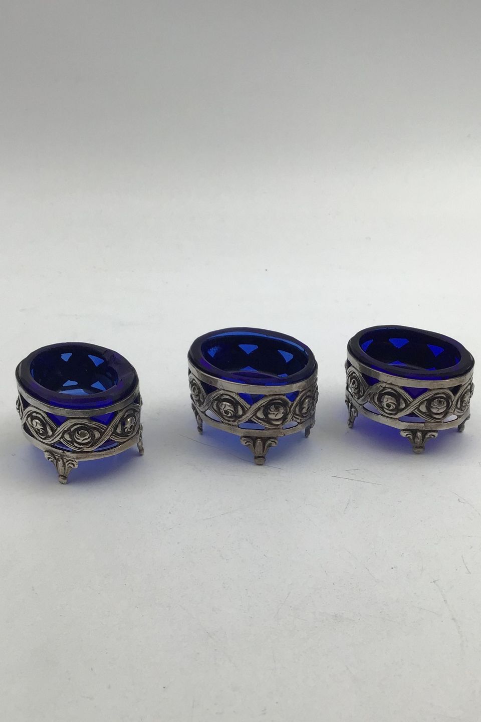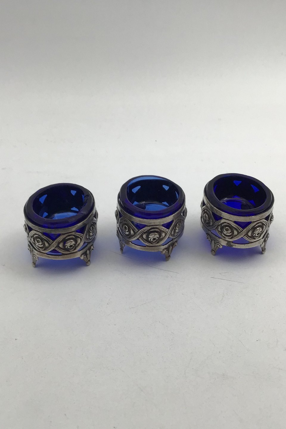 Silver Salt Cellars Set (Blue glas insert) (2+1) Measures 3.5 cm x 2.8 cm (1.37 inch x 1.10 inch) Combined Weight 66.4 gr (2.34 oz) (One is chipped)