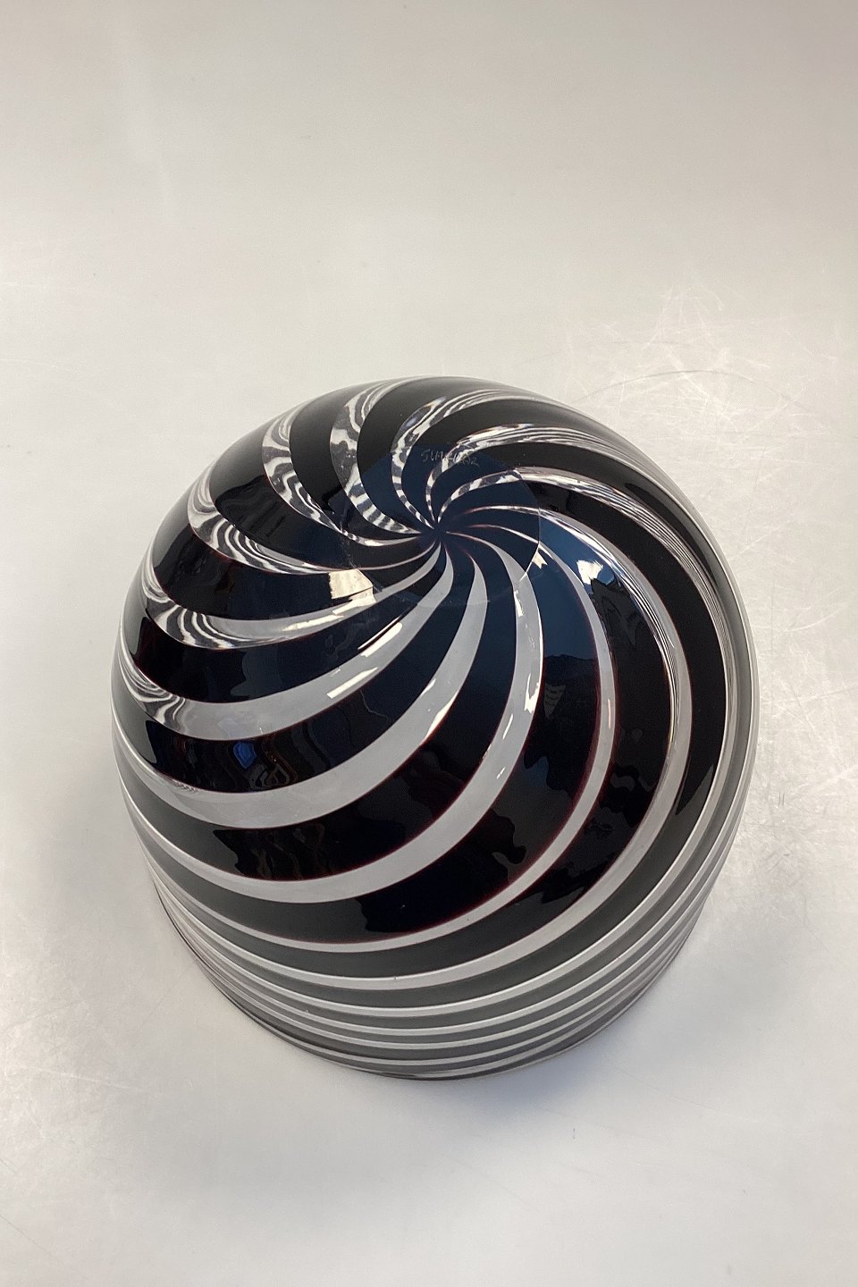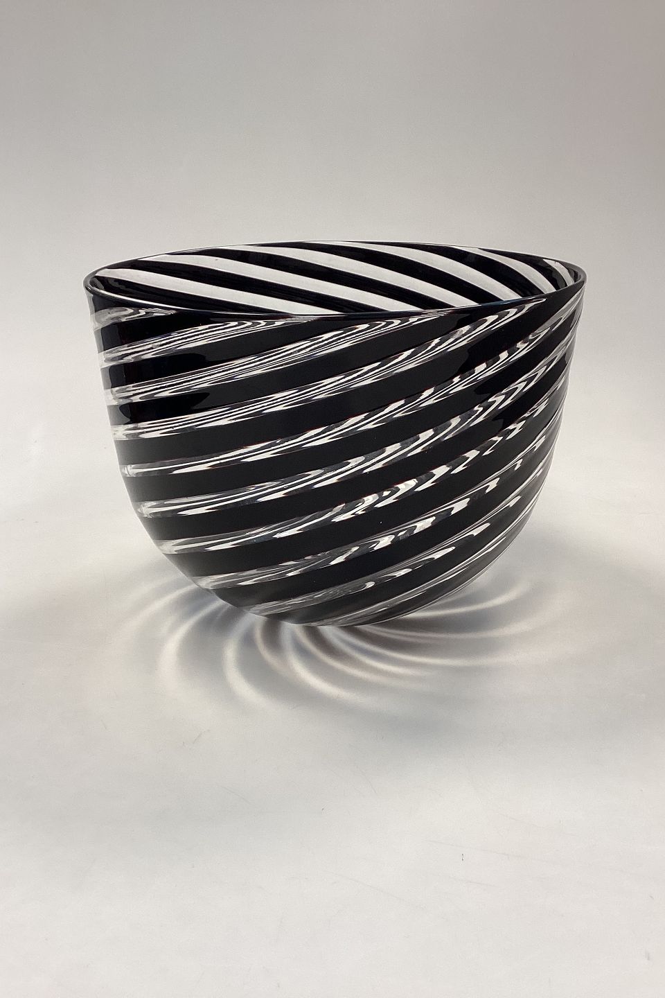 Glass Bowl by Peter Svarrer in black and white stripes. Signed at the bottom. Measures 16.5 cm x 22 cm / 6.5 in. x 8.66 in.