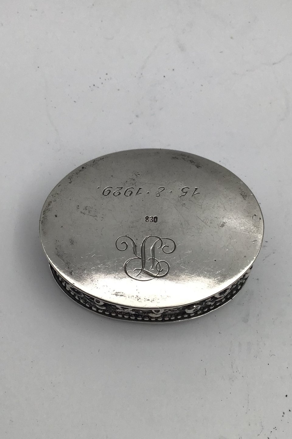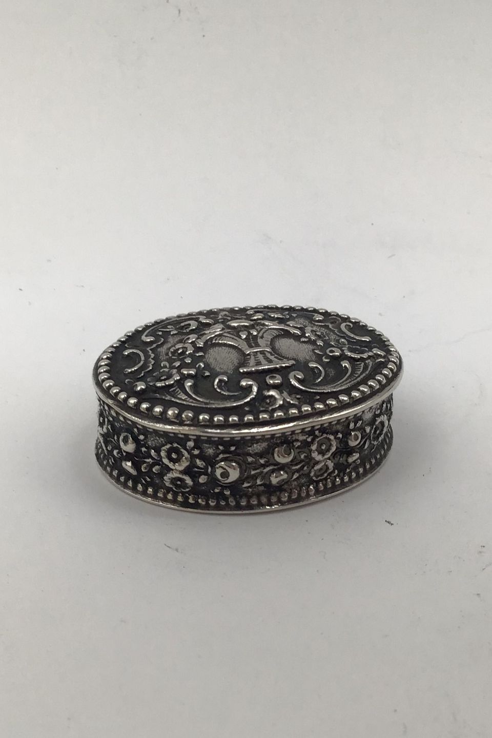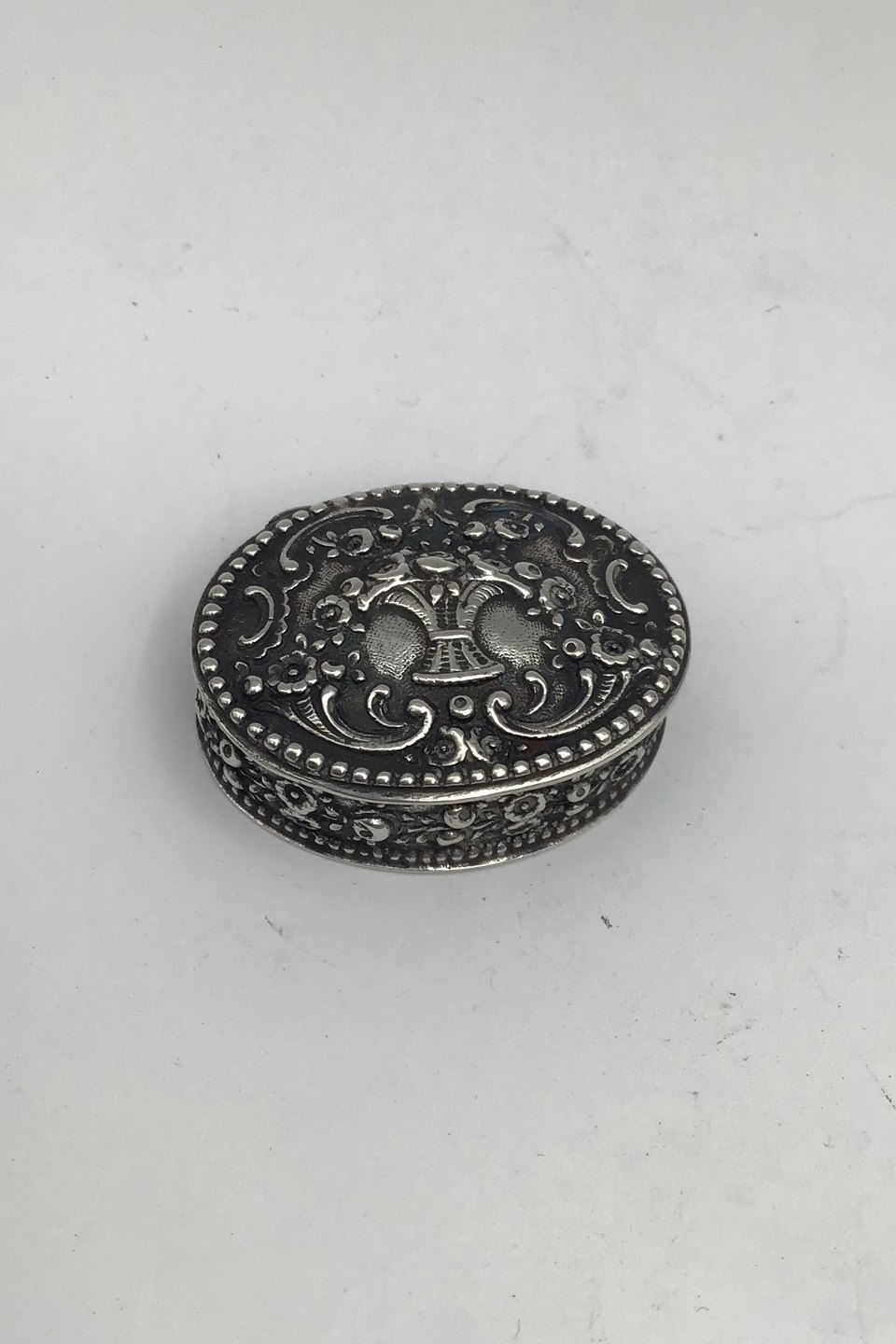 Norwegian? Silver Oval Pill Box Floral Motif Measures 4 cm x 3 cm (1.57 inch x 1.18 inch) Weight 25.1 gr (0.89 oz) (Engraved)