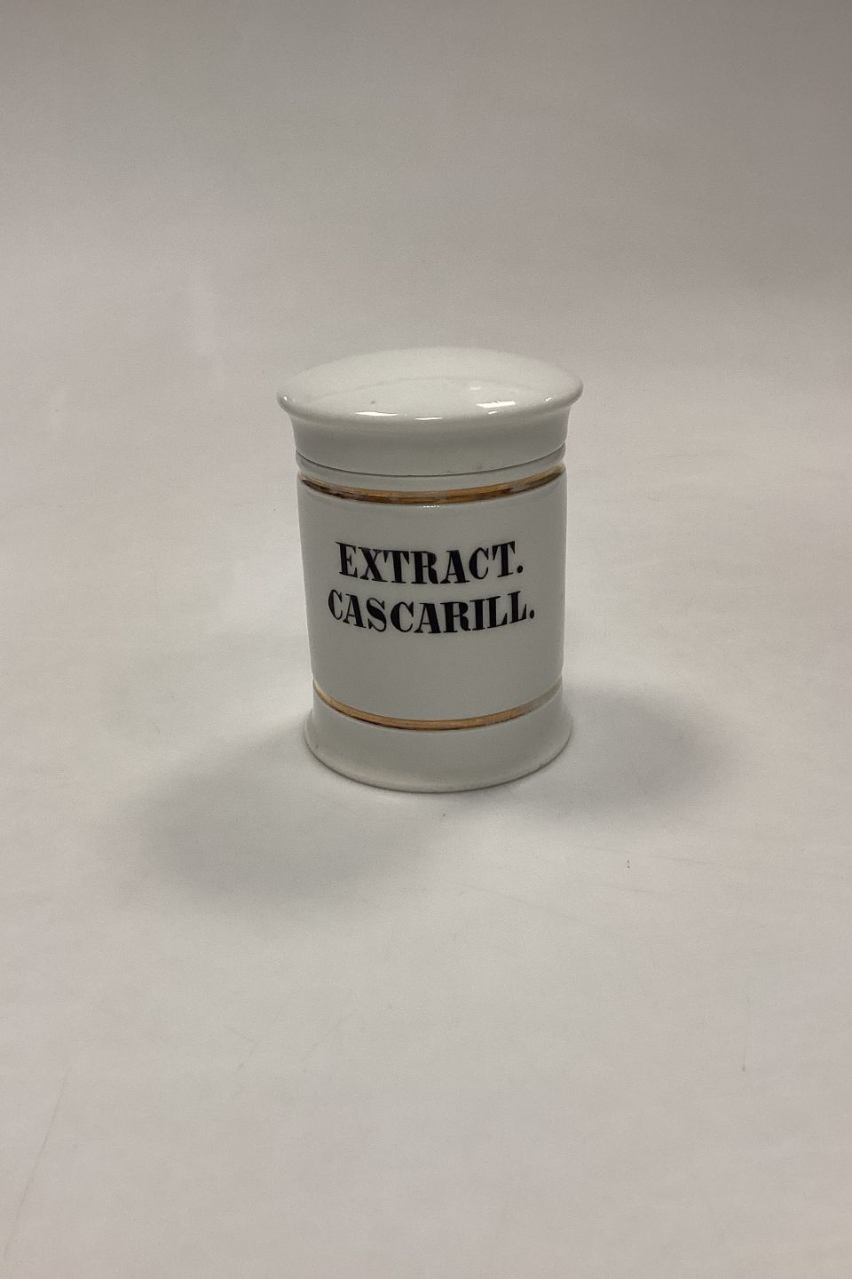 Porcelain Apothecary Jar: EXTRACT. CASCARIL. In fine condition, but with wear on the gold edge. Measures 10.5 cm / 4.13 in.