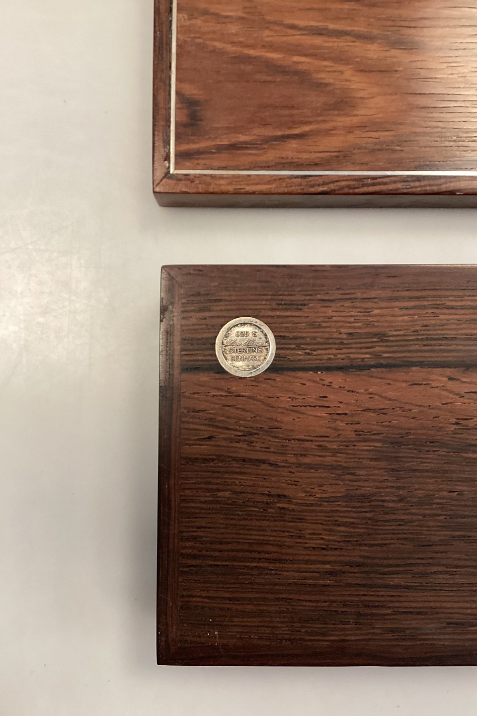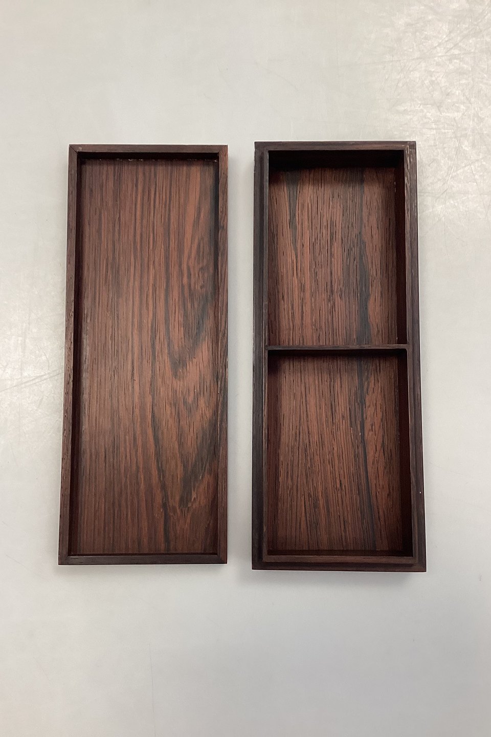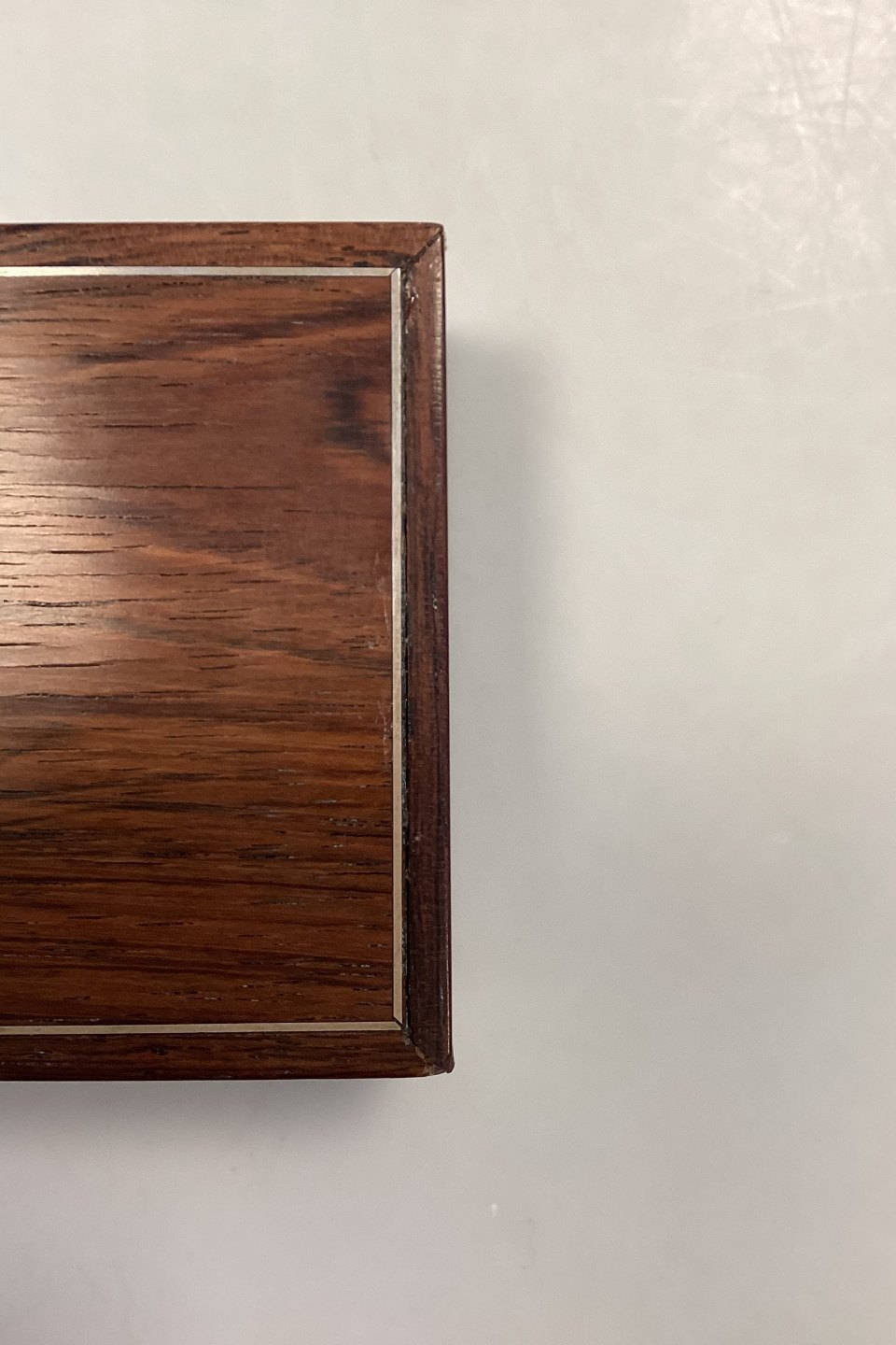 Hans Hansen Rosewood Box with two compartments and loose lid with sterling silver inlay. Has scratches in the silver plate, and is glued at the right end of the lid. Measures 20.9 cm x 8 cm x 3.2 cm / 8.22 in. x 3.14 in. x 1.25in.