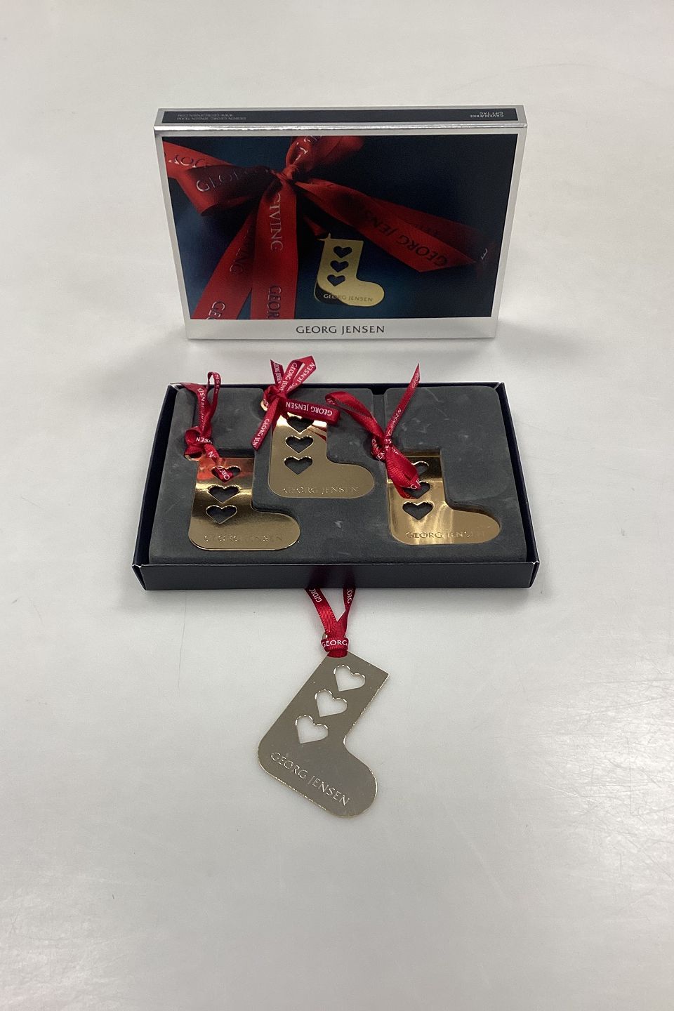 Georg Jensen Gift Tag - Christmas Sock with Hearts. Box with 3 pcs. and 1 extra. Gilded brass. Designed by the Georg Jensen Team.
