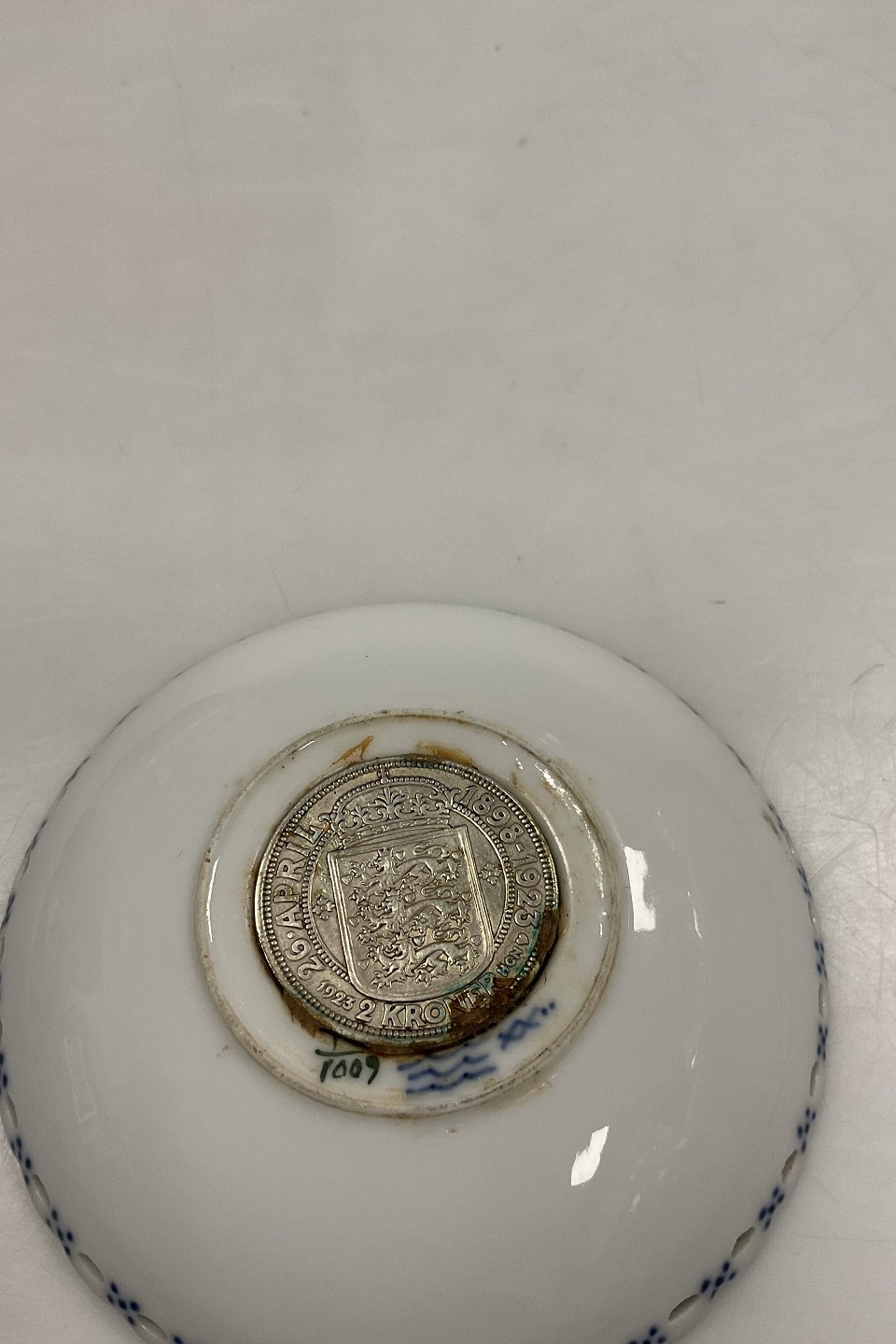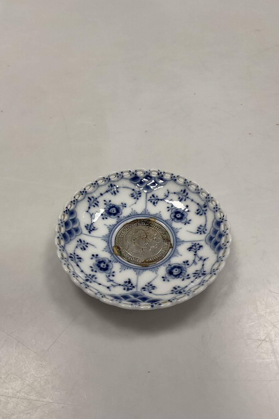 Royal Copenhagen Blue Fluted Full Lace Ashtray / Plate with Silver Coin No 1/1009. 9 cm (3 35/64")