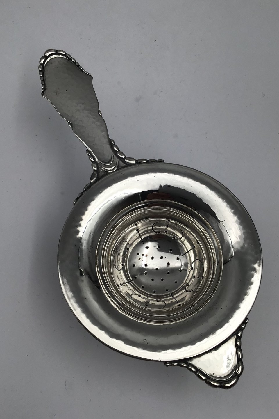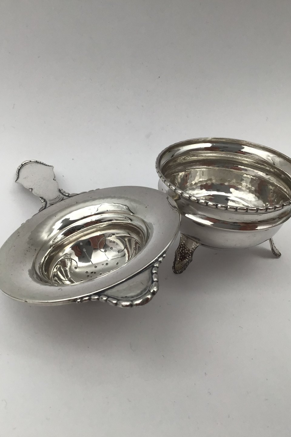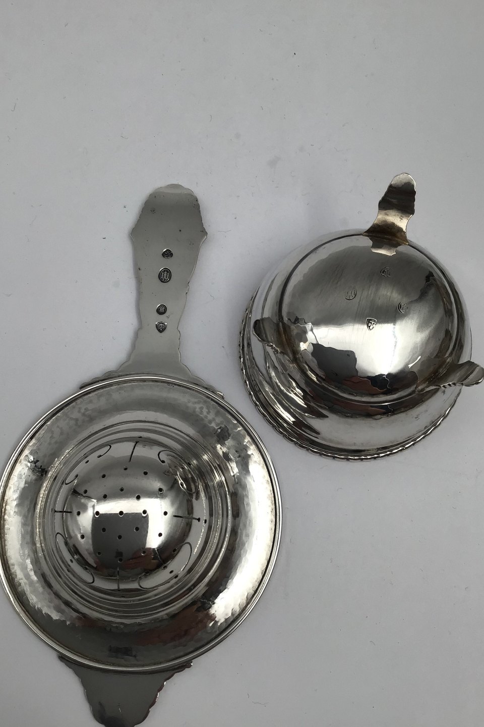 CTC/Danish Silver Christiansborg Tea Strainer and Stand Measures Strainer L 15 cm (5.90 inch) Stand Diam 6.5 cm (2.55 inch) H 4.5 cm (1.77 inch) Combined Weight 78 gr (2.75 oz)
