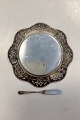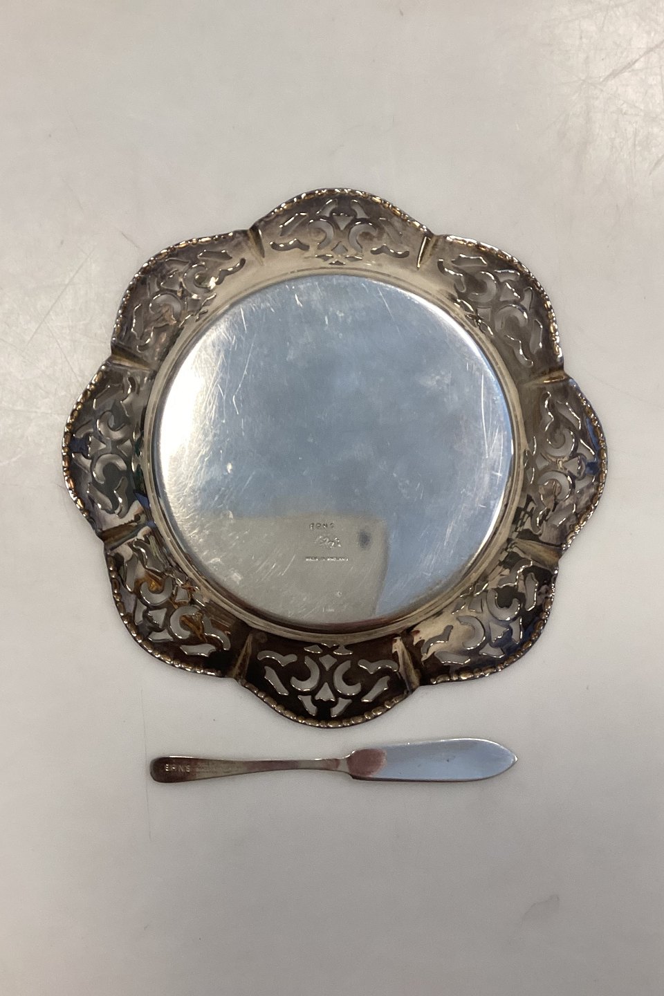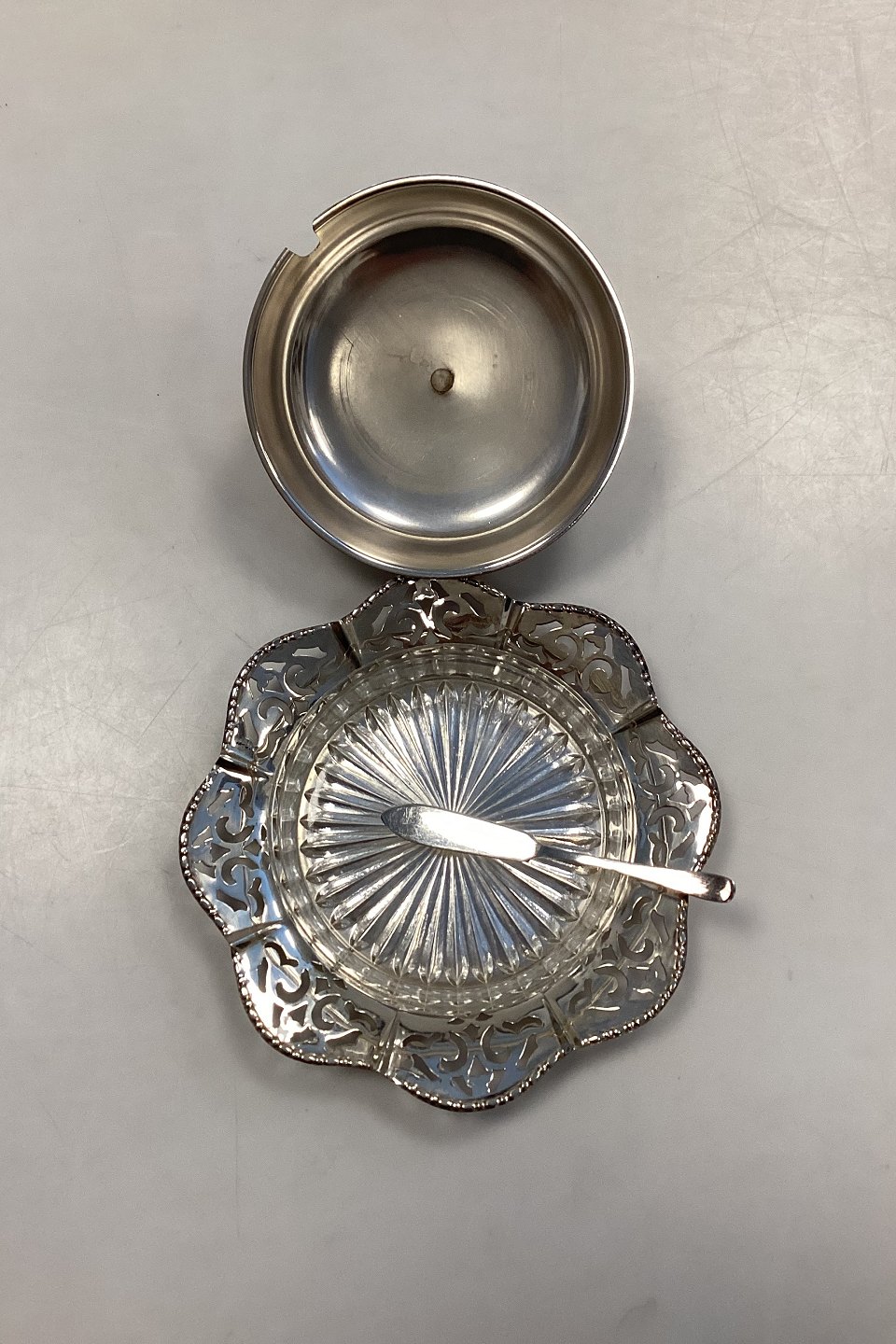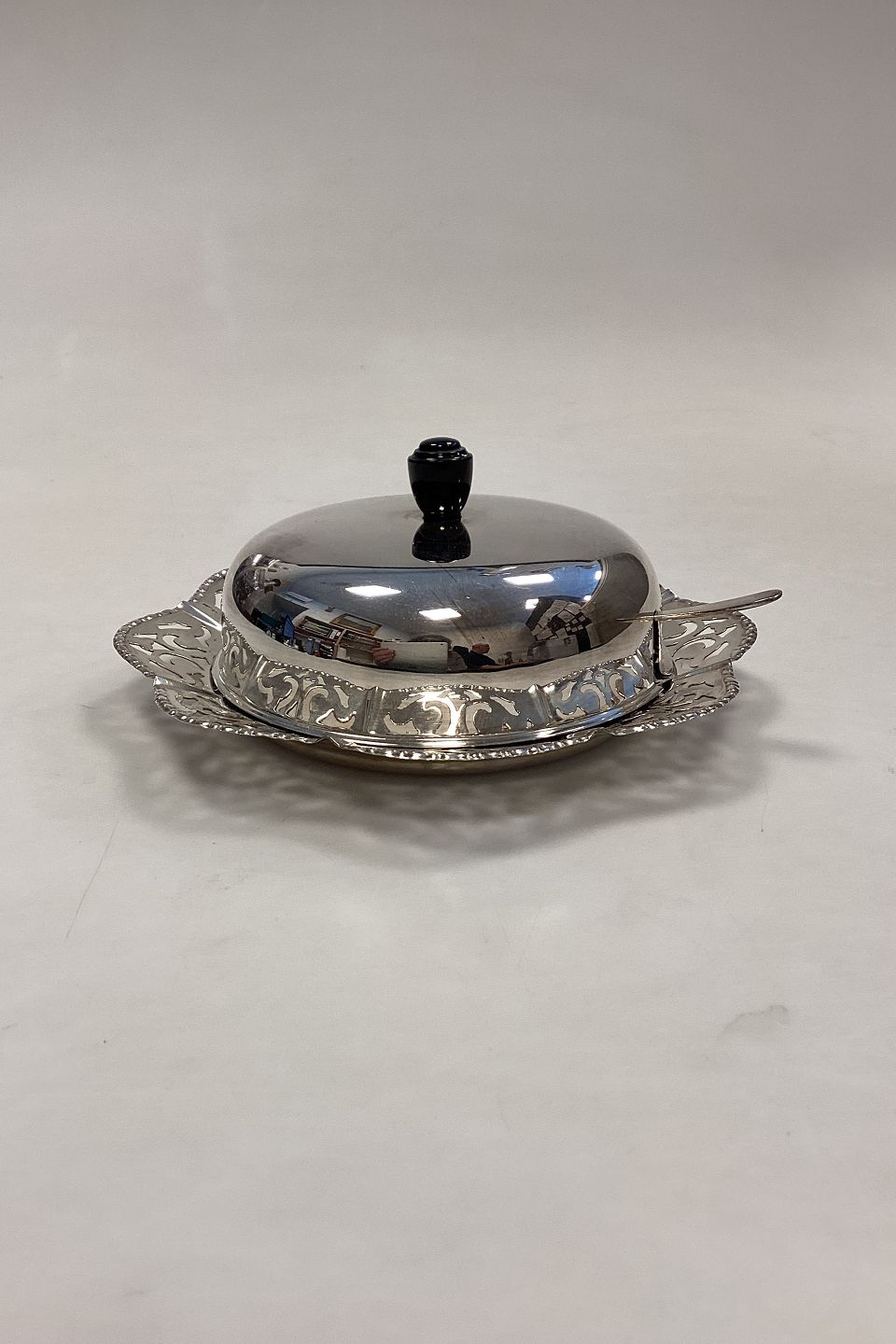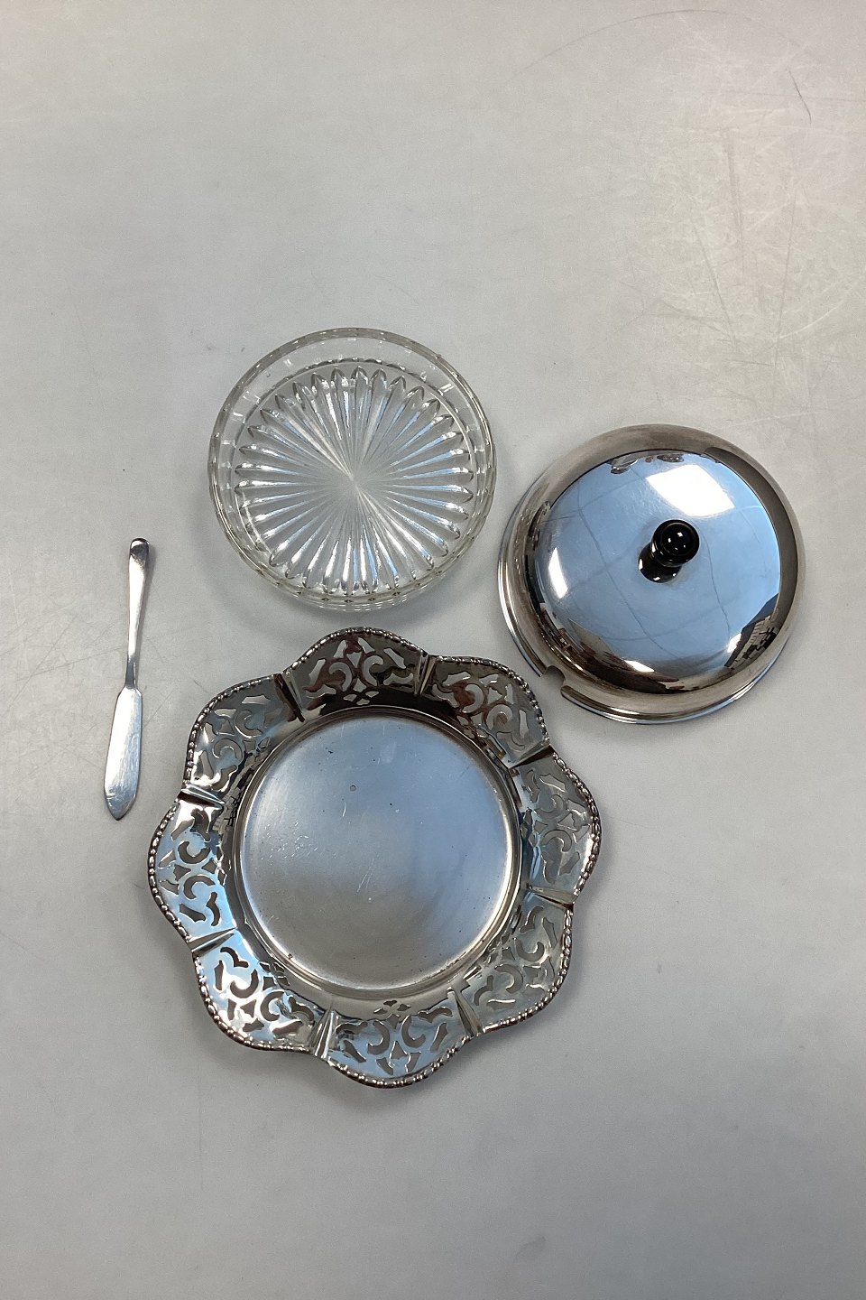 E.P.N.S. de Montfort Silver Plate Butter dish with glass dish and butter knife. Designed in Sheffield, England.