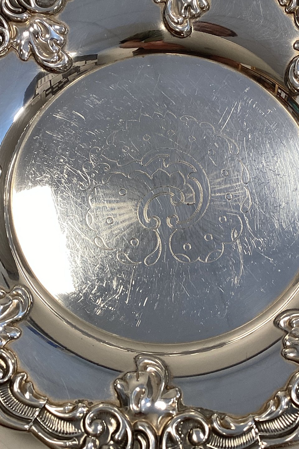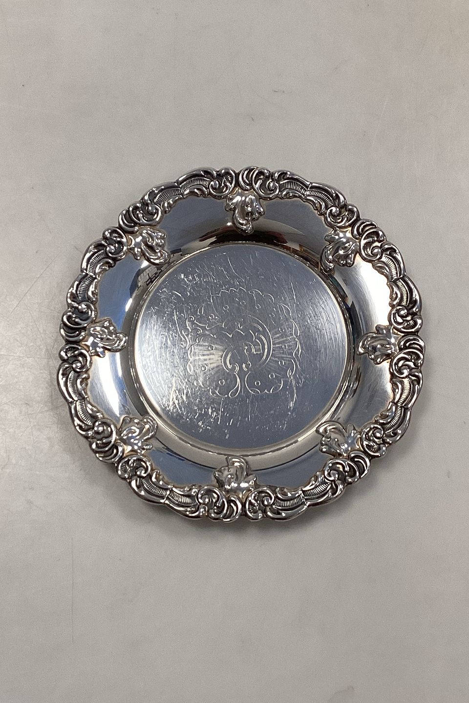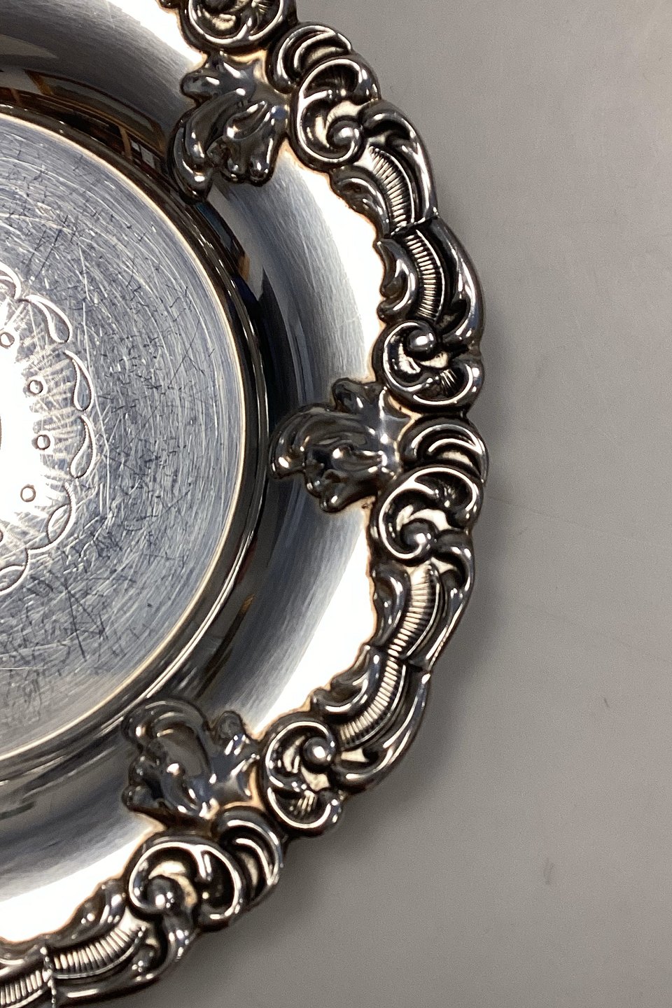 Danish Holger Noersgaard Silver Plated Bottle Tray. Beautifully crafted edge decoration. Engraved decoration on the plate surface. Measures 16.2 cm / 6.38 inches