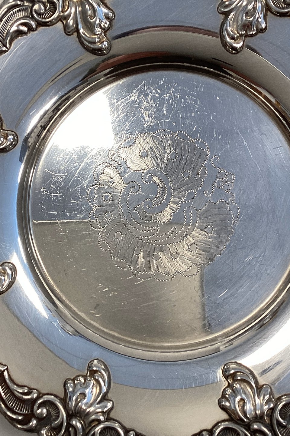 Danish Holger Noersgaard Silver Plated Bottle Tray. Beautifully crafted edge decoration. Engraved decoration on the top surface. Measures 17.8 cm / 7 inches