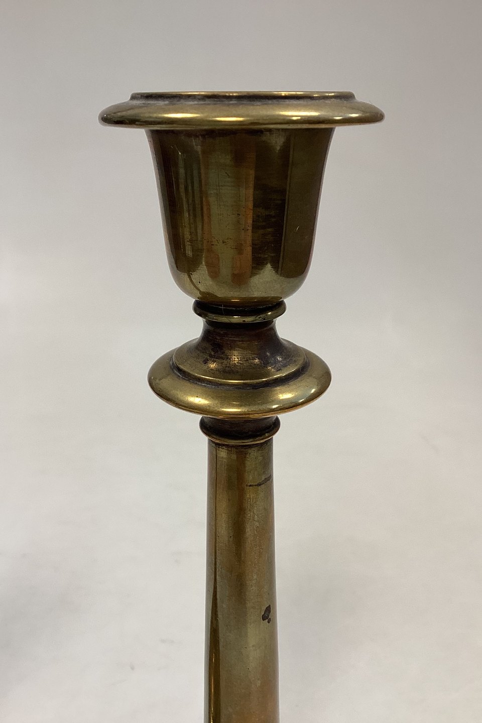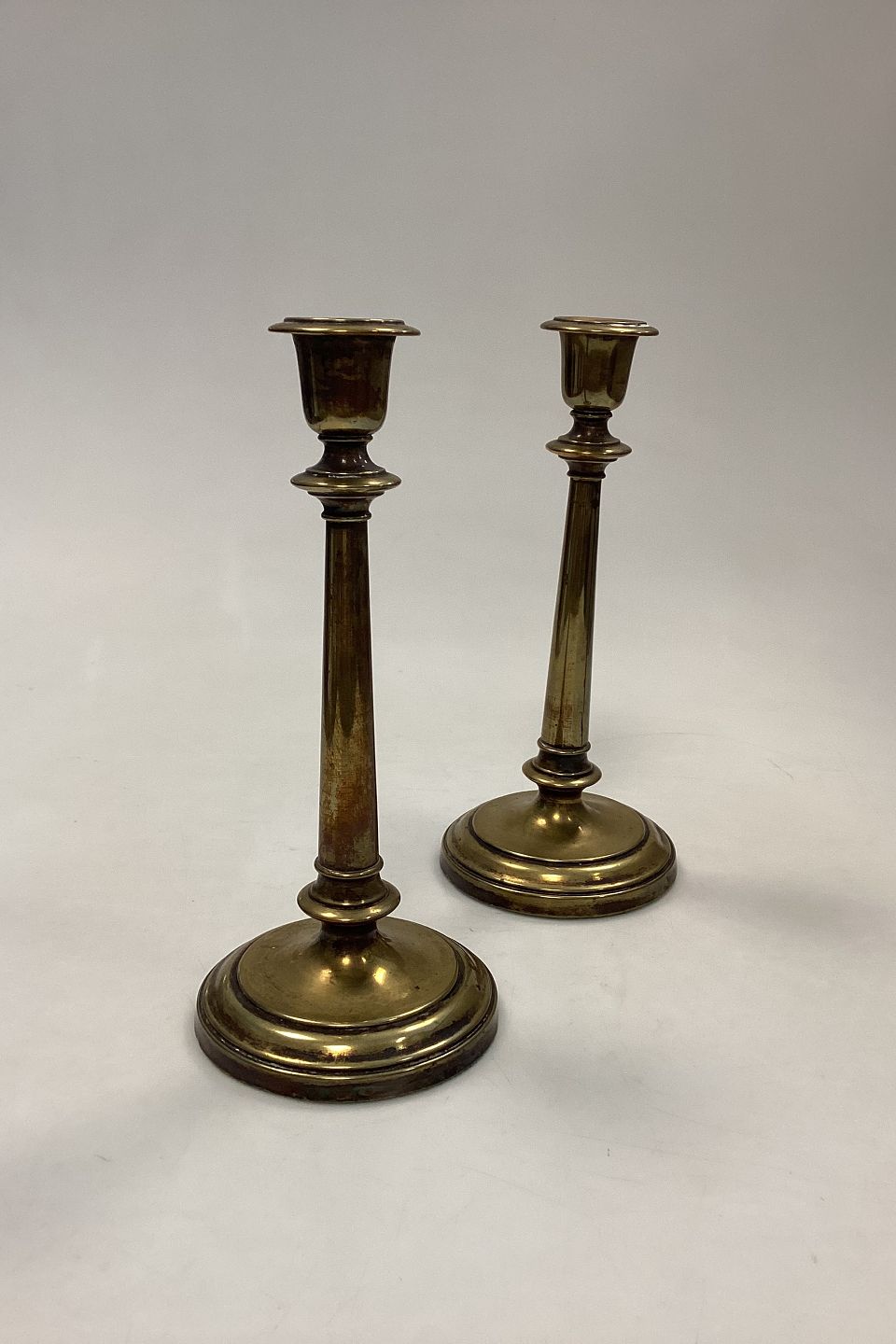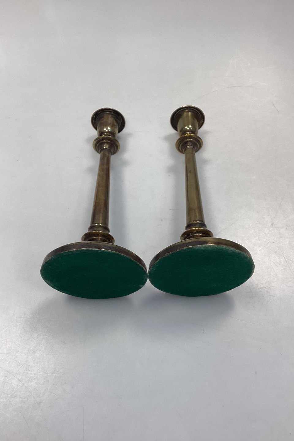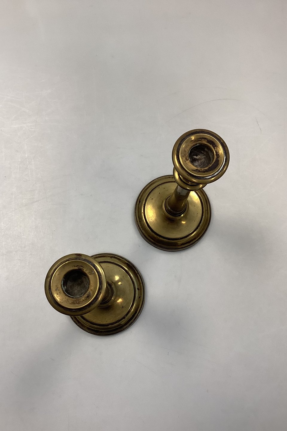 Antique pair of tall Candlesticks in Brass. Light wear, small dents and scratches.
