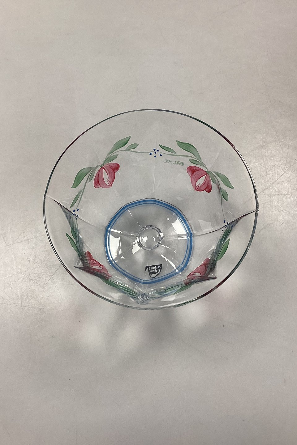 Orrefors Maja Glass bowl with red flowers and blue striped rim on foot. Designed by Eva Englund. Signed EE.AL. Made in Sweden.