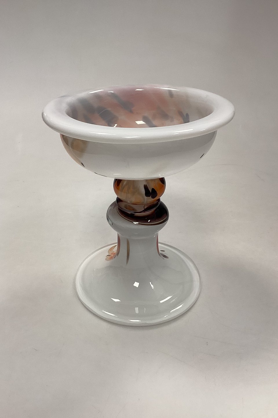 Holmegaard Cascade Glass Bowl / Candlestick. Designed by Per Lütken. The bowl is opal white, with multi-colored orange, black, and beige tones. Signed HG6 PL.