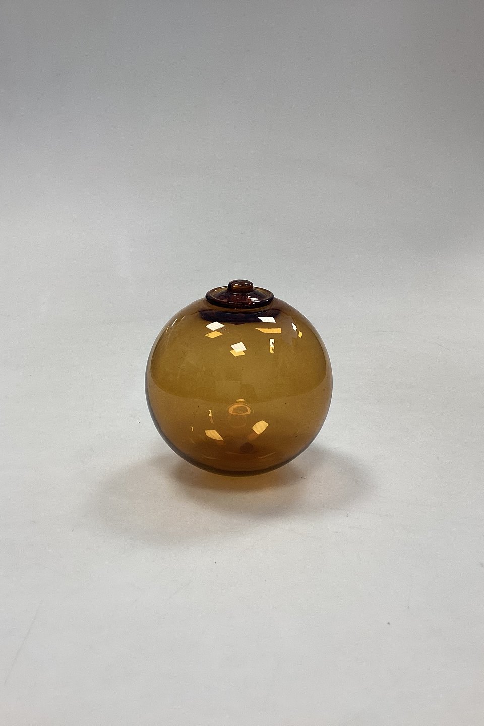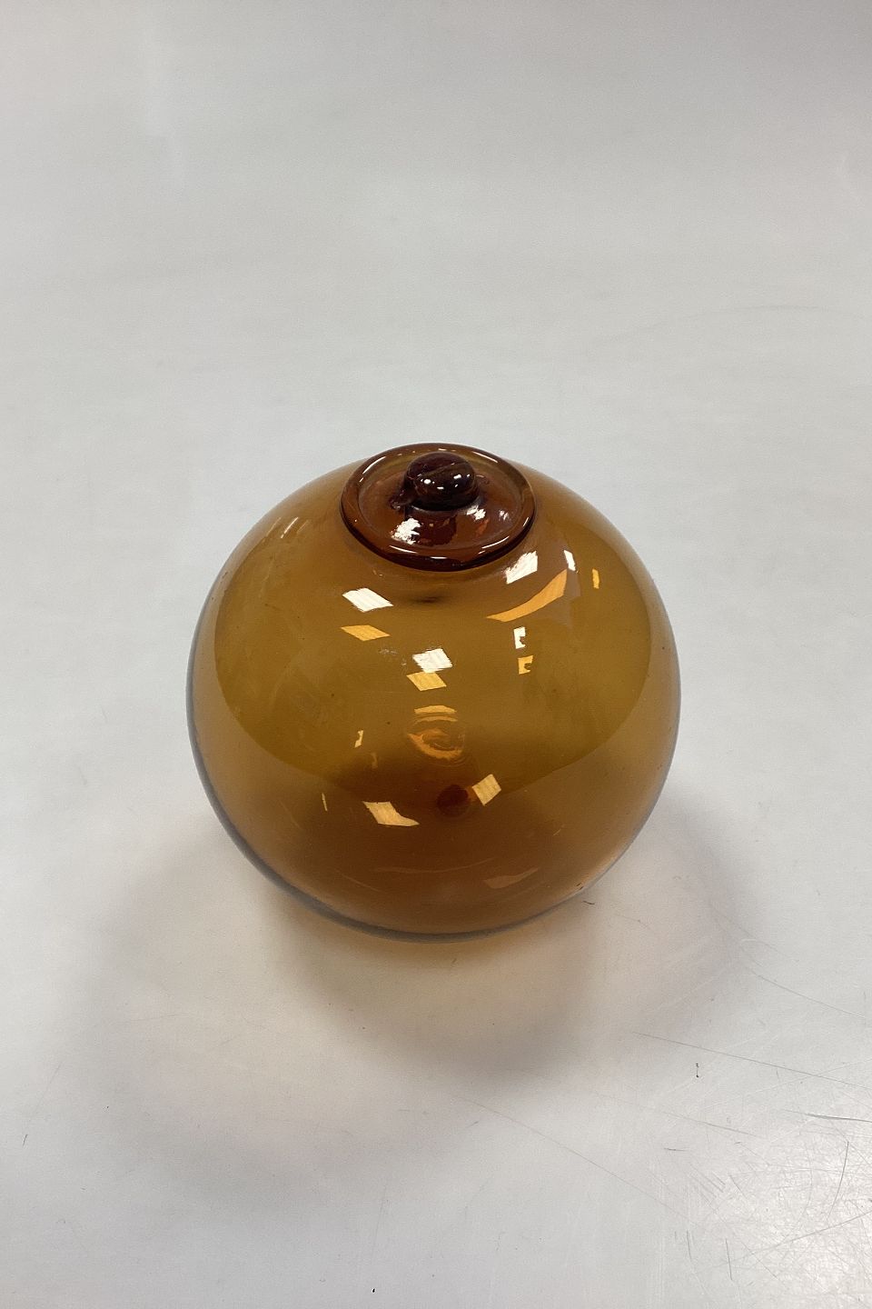 Holmegaard / Kastrup / Fyens Glass Works Decorative Ball . Also called fish balls or glass floats. Designed by Michael Bang in 1967. Color: Amber. Hole for hanging.