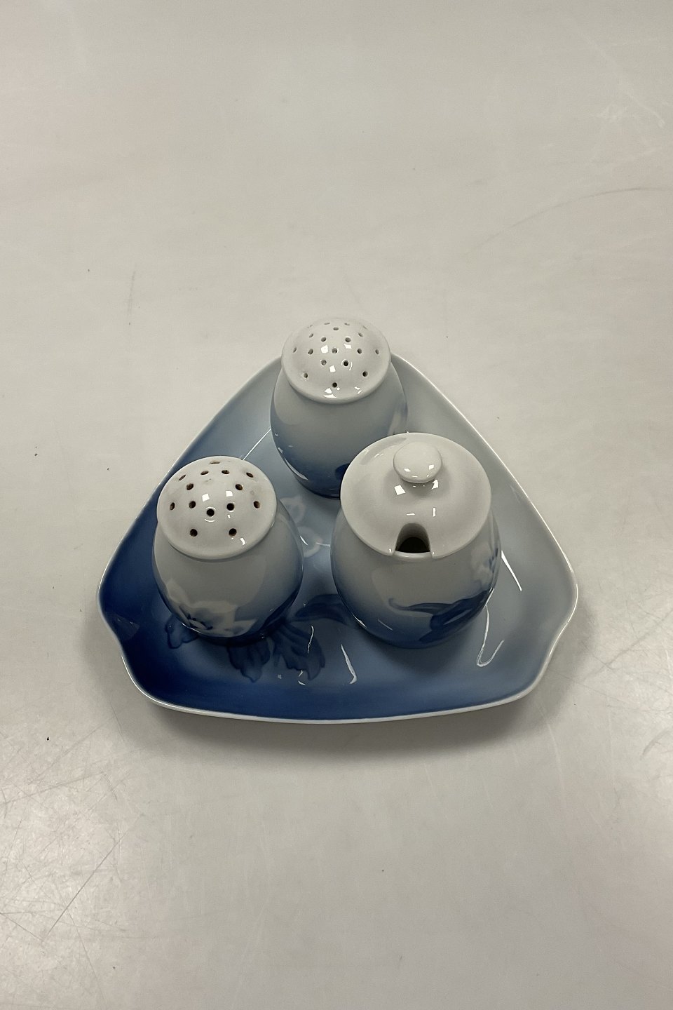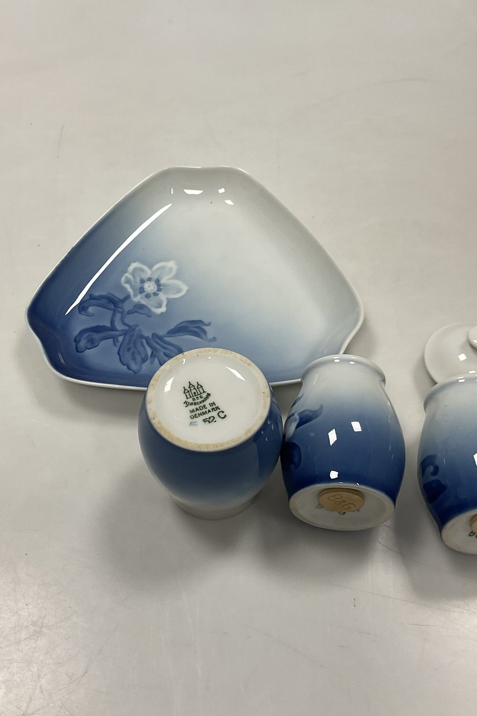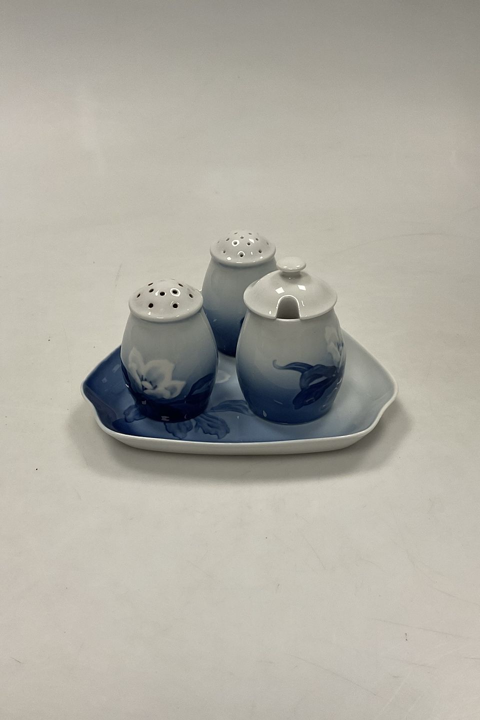 Bing and Grondahl Christmas Plat-de-ménage No 52. Dish No 52D measures 16 cm (6.30 inch). Mustard Jar No 52C and Salt and Pepper Shakers measures 7-8 cm (3 5/32 in).