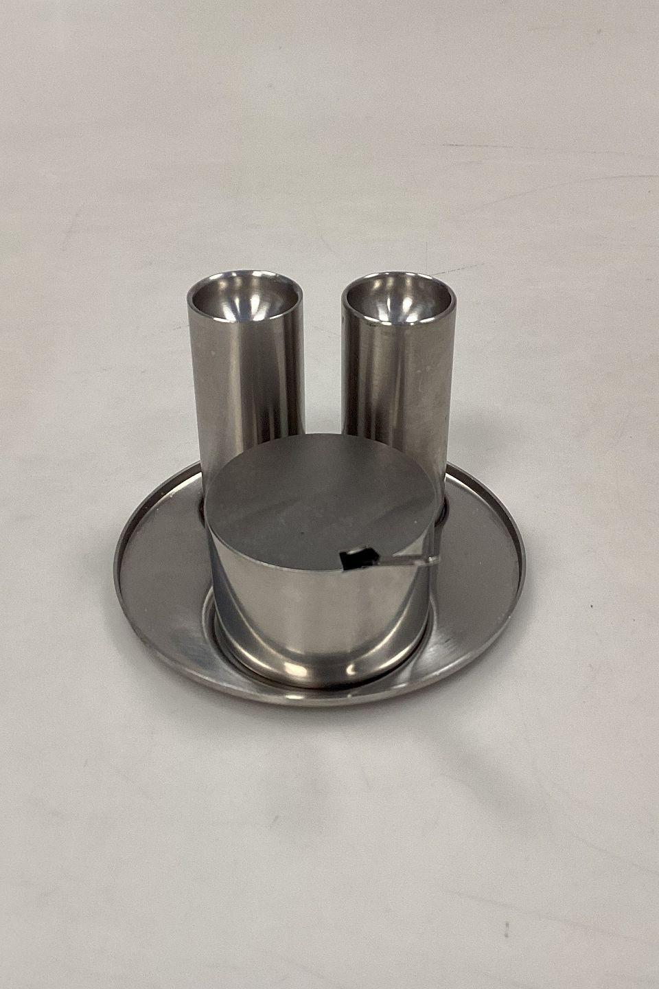 Contains Salt shaker, Pepper shaker, and Mustard jar with lid and spoon