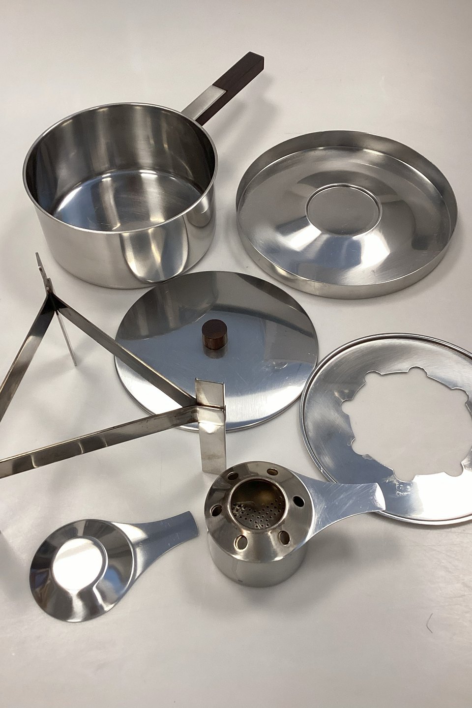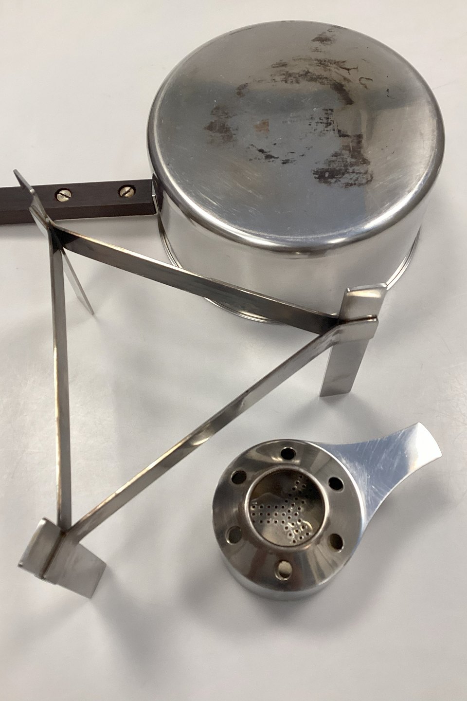 Stelton Peter Holmblad fondue pot set in stainless steel, with dark brown wooden handle