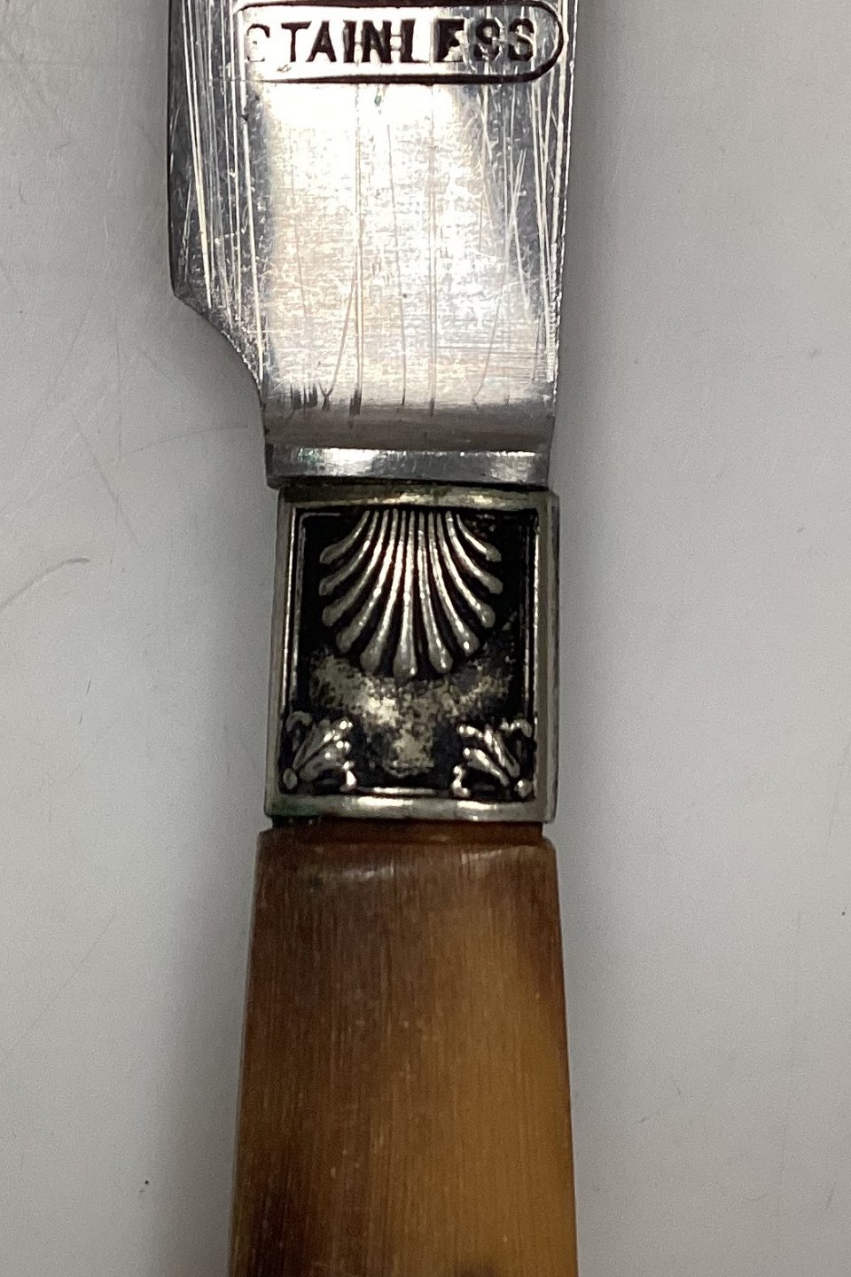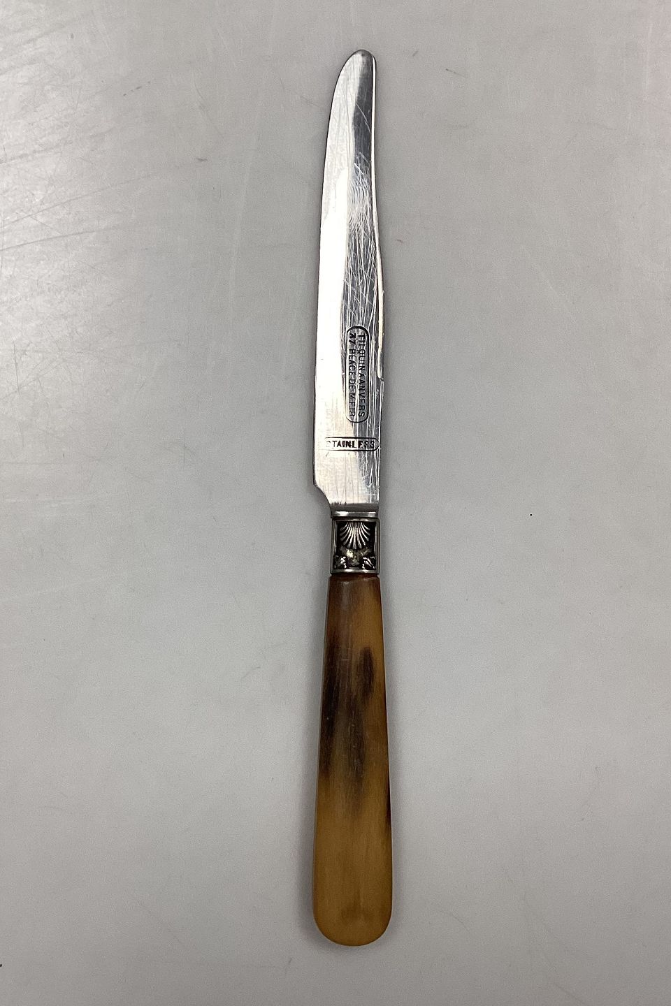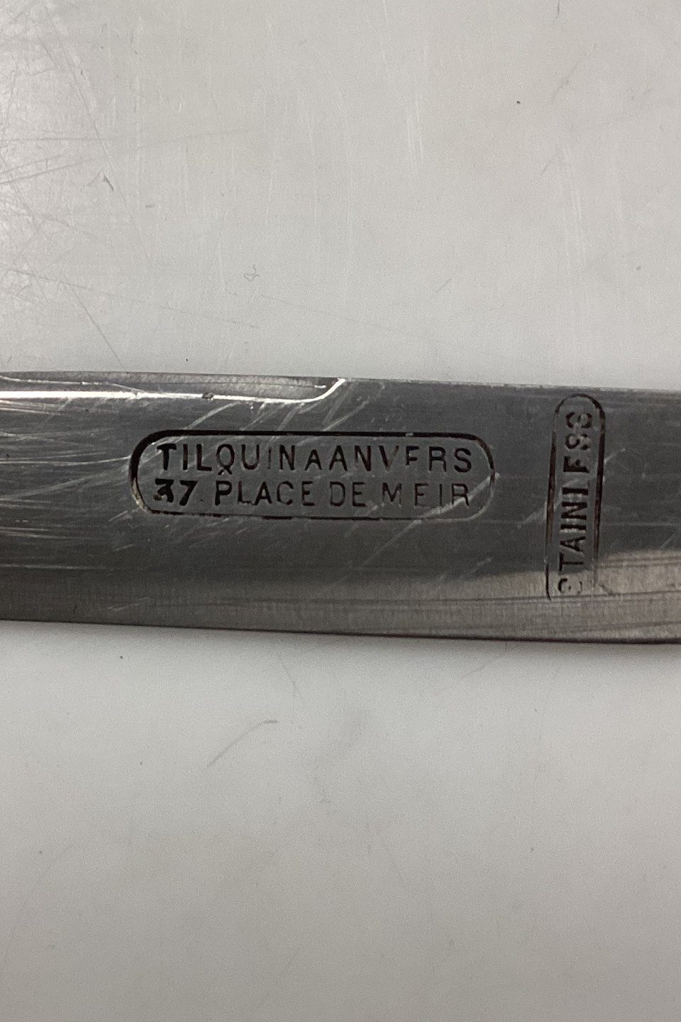 Tilquin-Anvers Stainless Lunch Knife with tan/brown bakelite/plastic handle and Clam motif. In good condition.