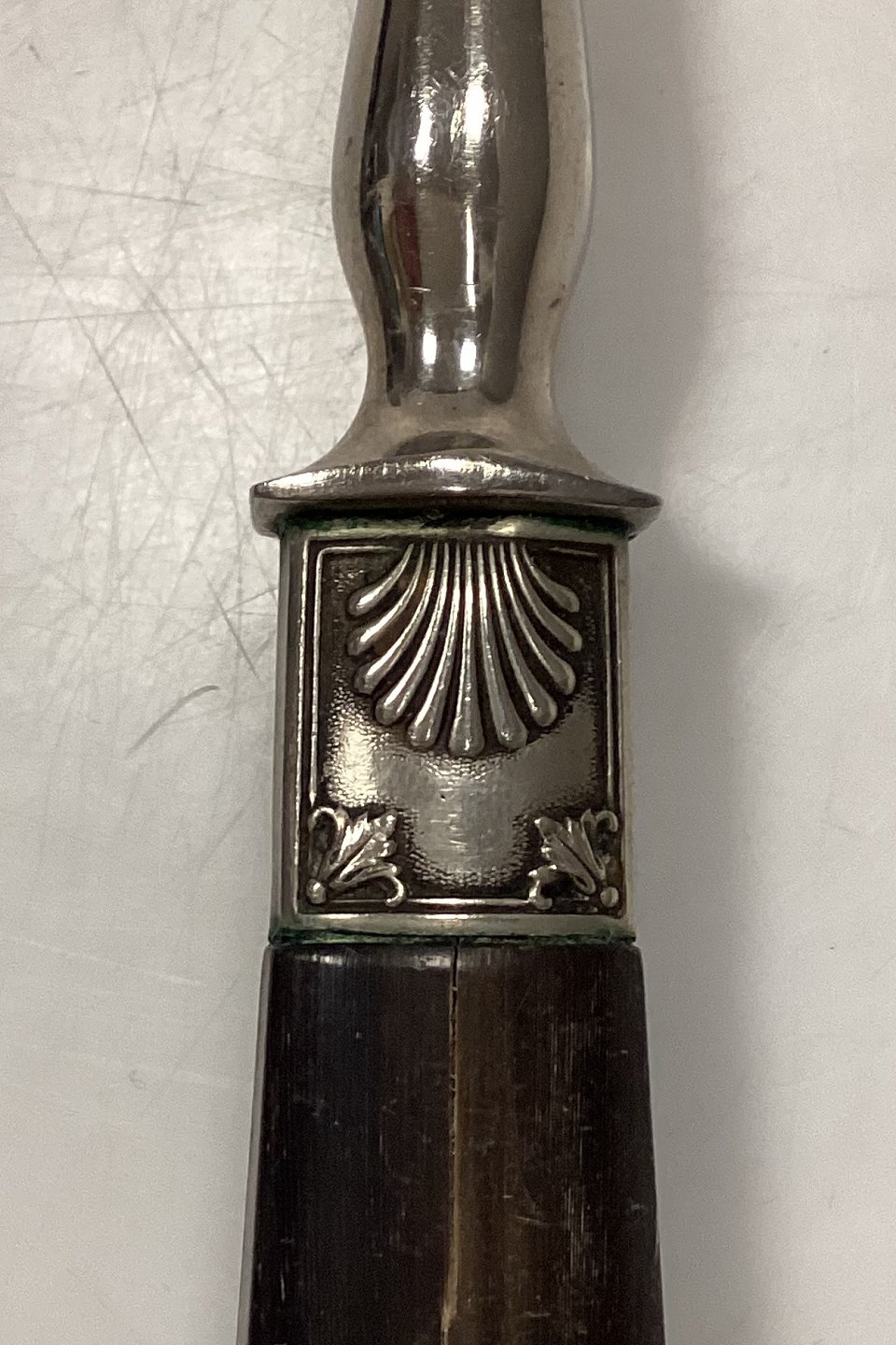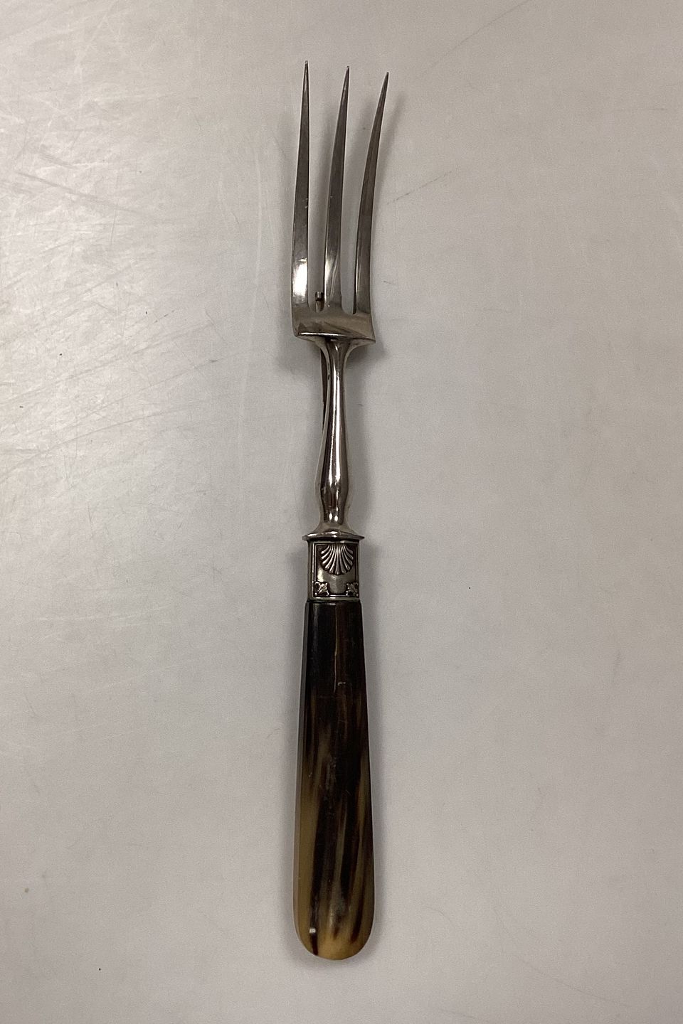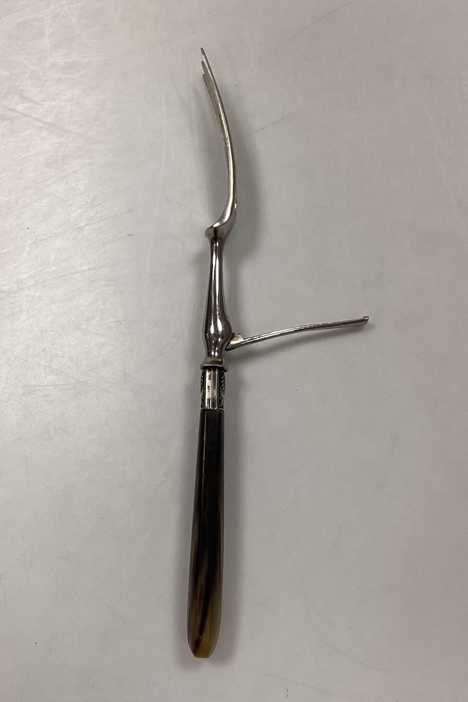 Tilquin-Anvers Stainless Meat Fork with tan/brown bakelite/plastic handle and Clam motif. Has a foldable mechanism on the back. In good condition.