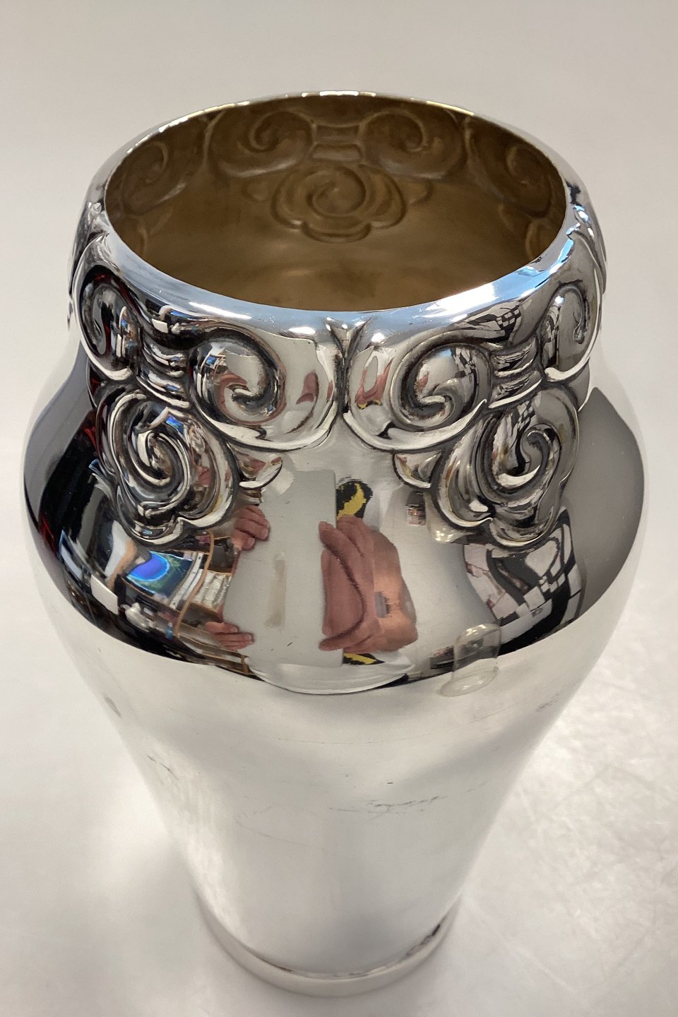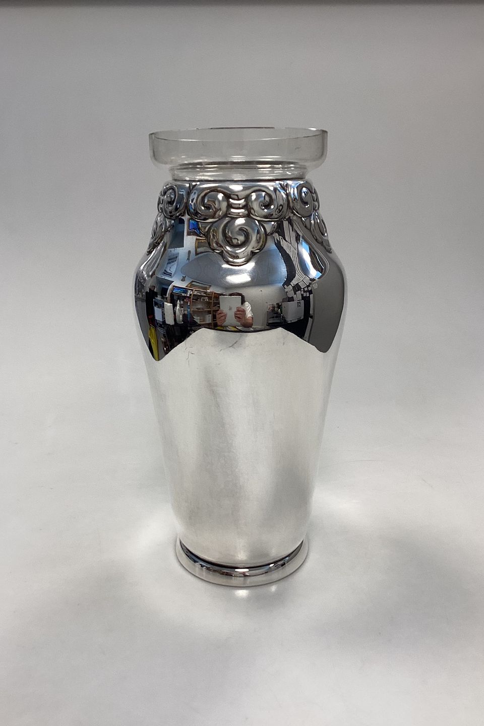 Art Nouveau / Deco Silver Plated Vase with glass insert. Danish produced brand Eneret Astral. Clear signs of wear on one side, see photos.