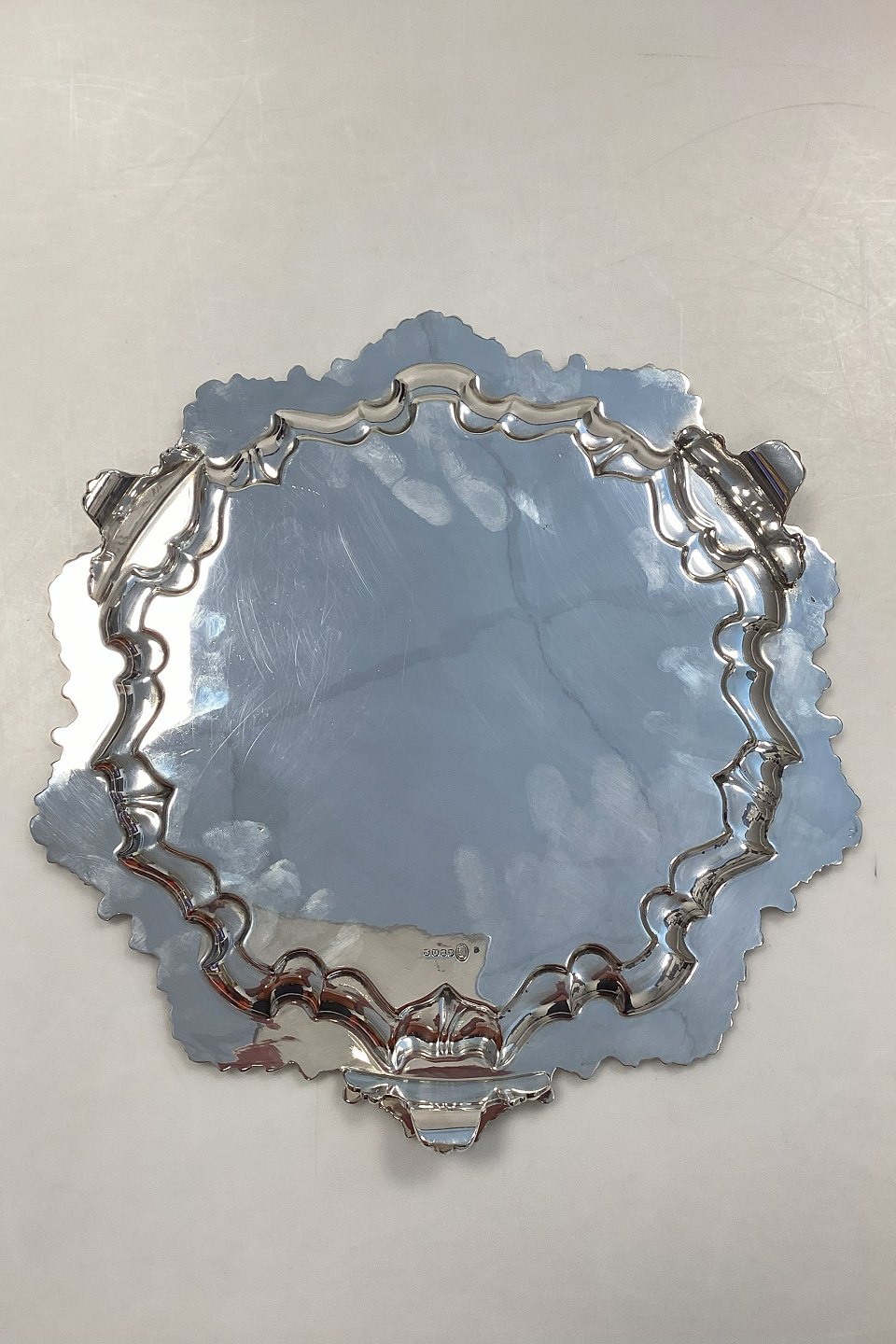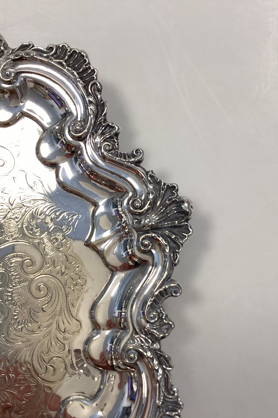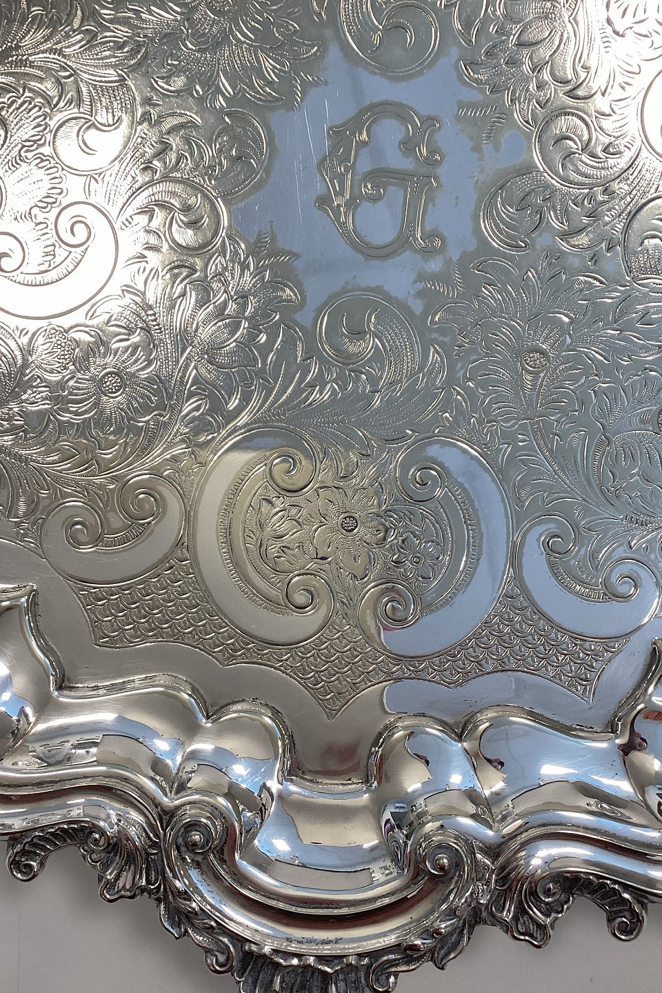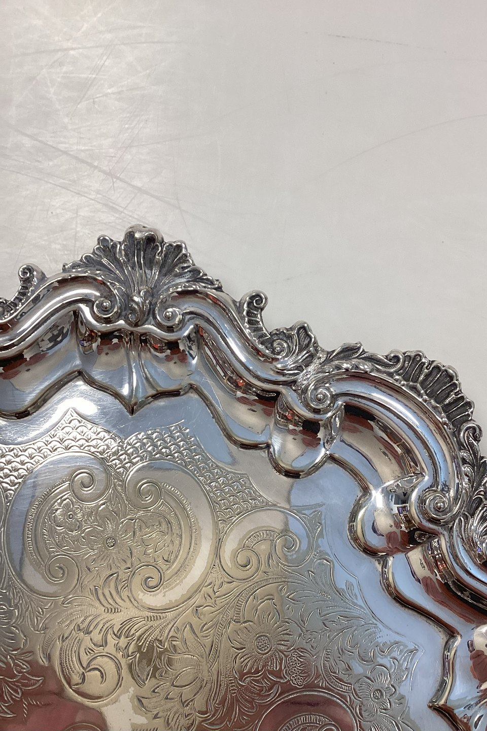 Ornamented English Silver Plated Serving Tray with Legs, Made in England.