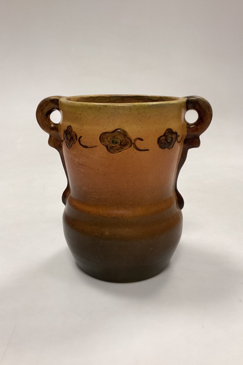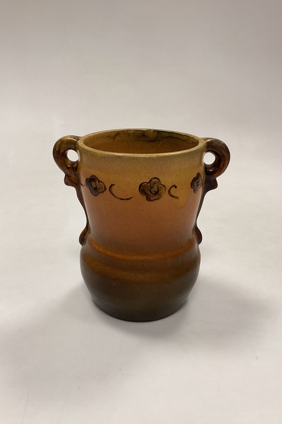 P. Ipsen's Widow Vase No. 412. Stoneware with yellow and brown glaze, with embossed flowers on the edge.