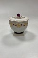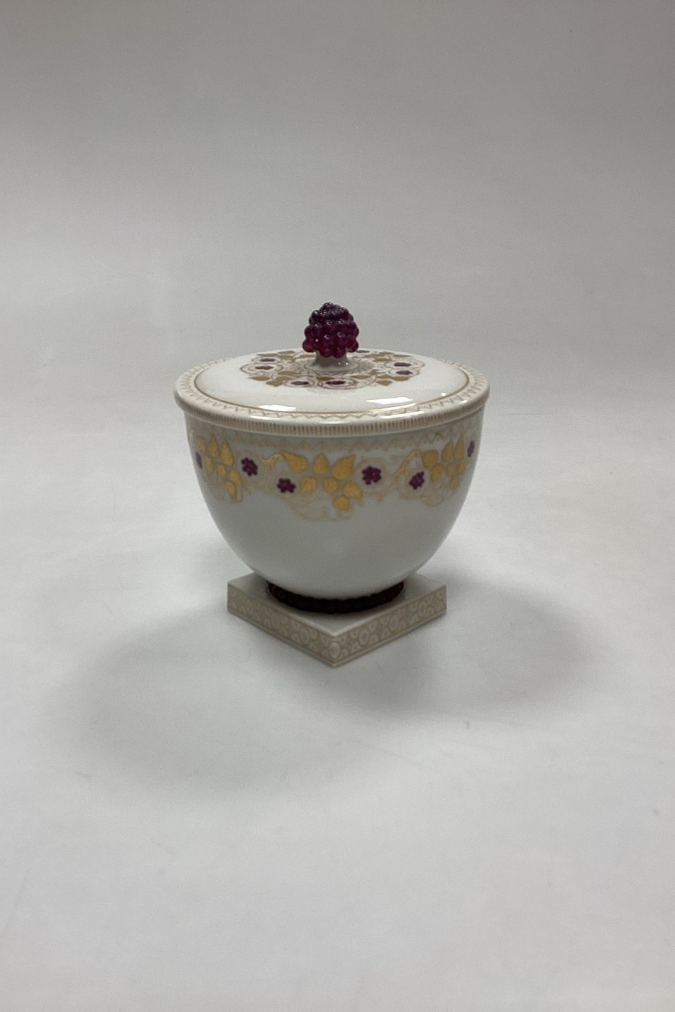 Bing and Grøndahl Hans Tegner Bonbonniere with Grapes. White with grape vines in gold and purple grapes in overglaze. Signed HT/Hans Tegner, LL/Lotte Lindahl and EK/Emma Kongsbøll.