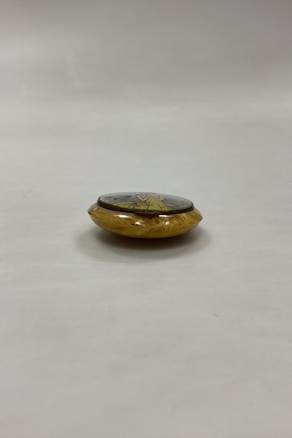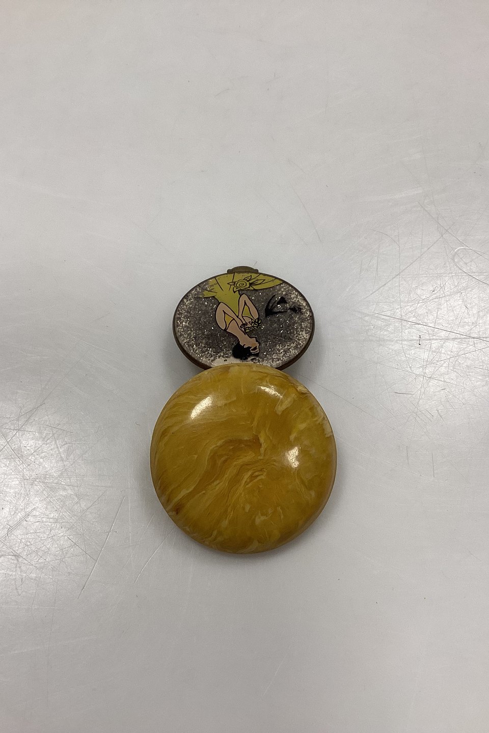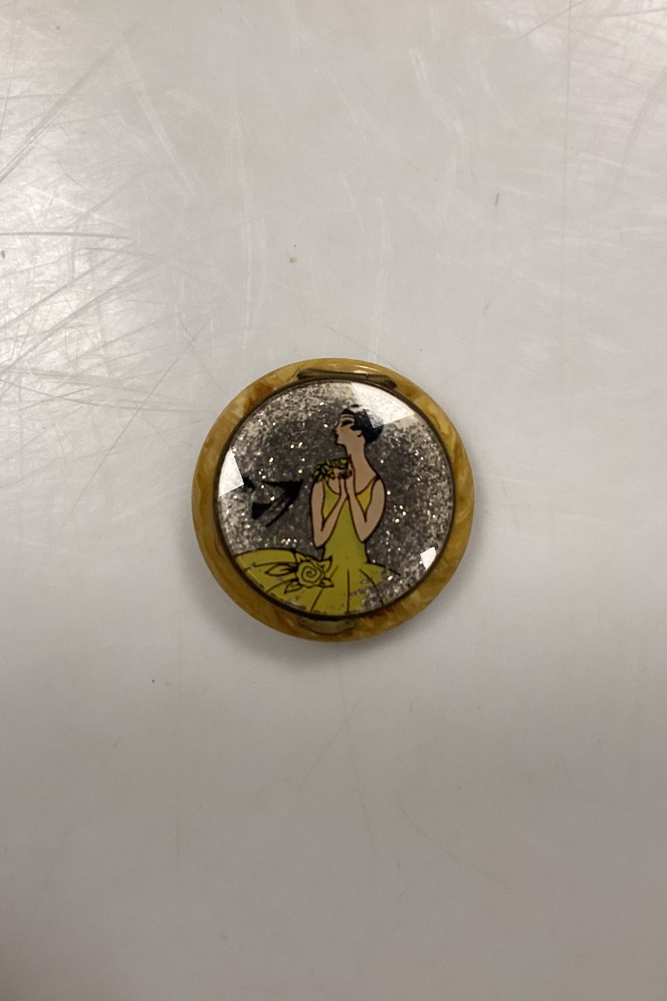 Art Deco Pillbox with Mirror. Presumably Bakelite in yellow marbling. Motif with woman in yellow dress on a background of silver glitter..