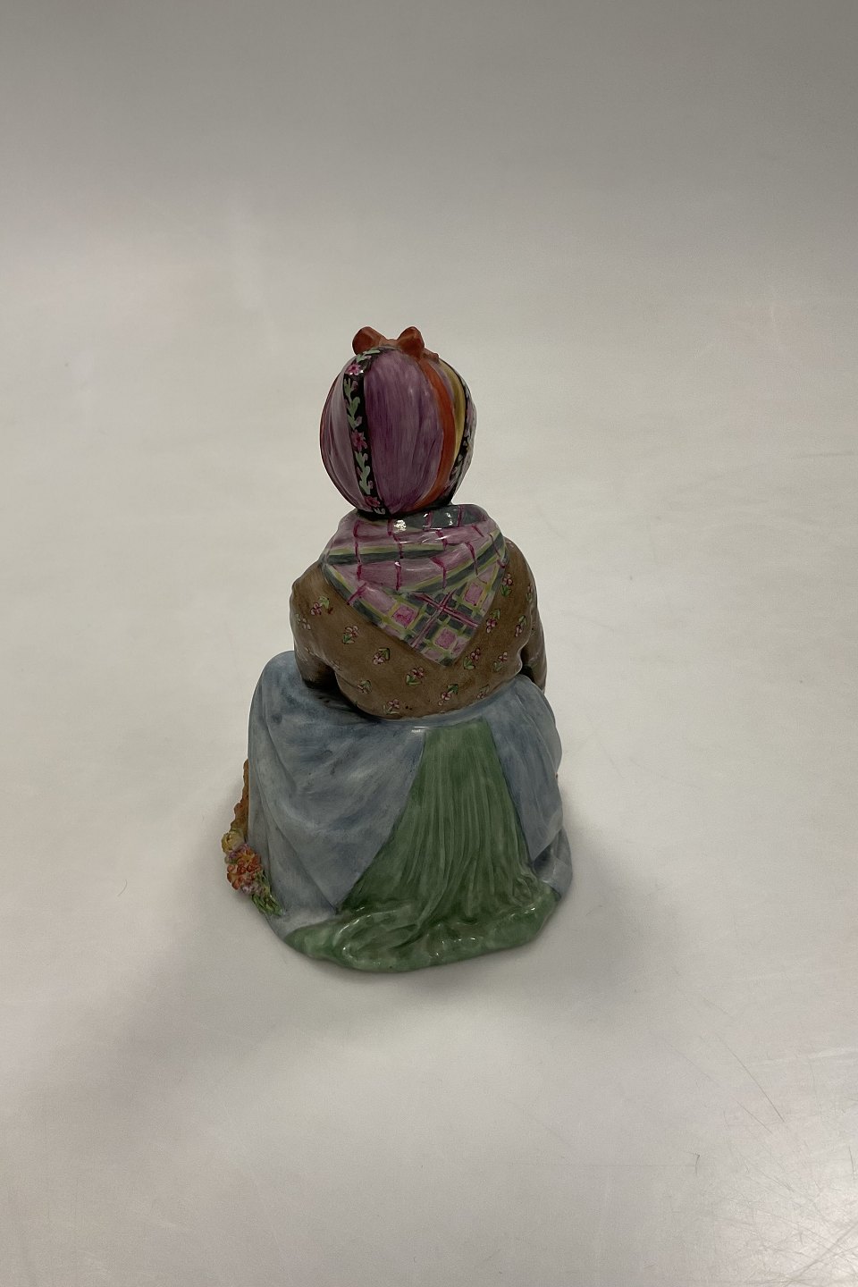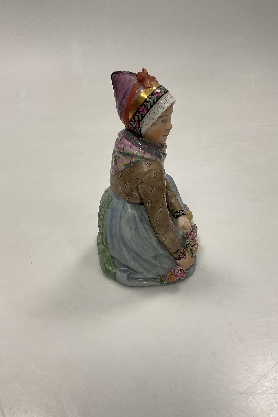 Royal Copenhagen Sitting Girl from Fanų by Carl Martin-Hansen No. 12413. With Juliane Marie Stamp. Measures 14.5 cm / 5 45/64 in. 1st Quality but with small chip at Flowers - see photos.