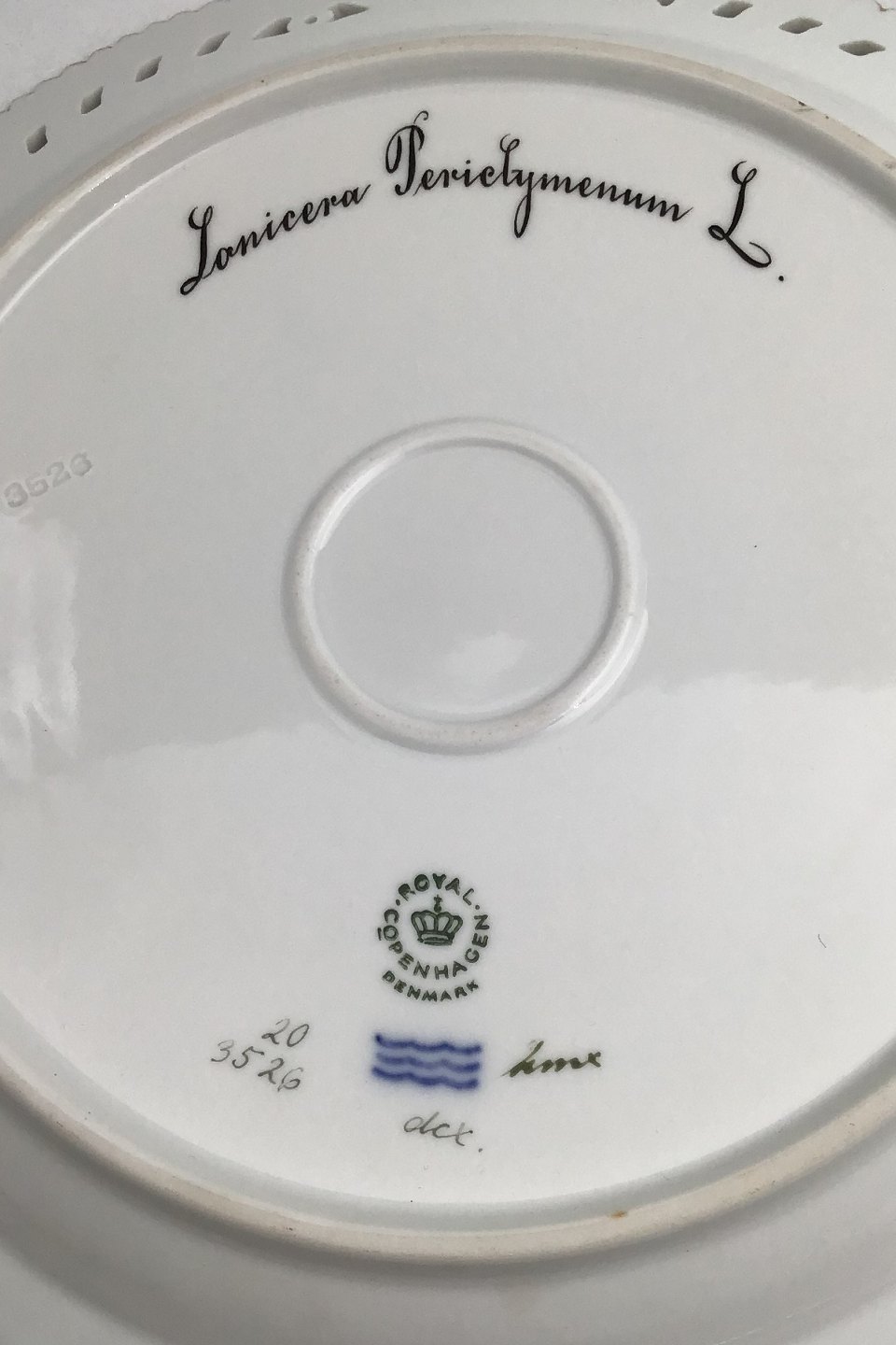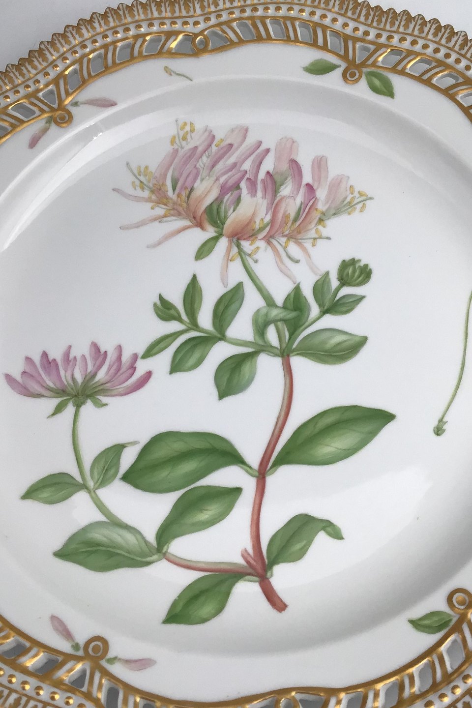 Royal Copenhagen Flora Danica Plate with pierced border No. 20/3526. Measures 27cm / 10.63 inch. 1st Quality Latin name: Lonicera Periclymenum L.
