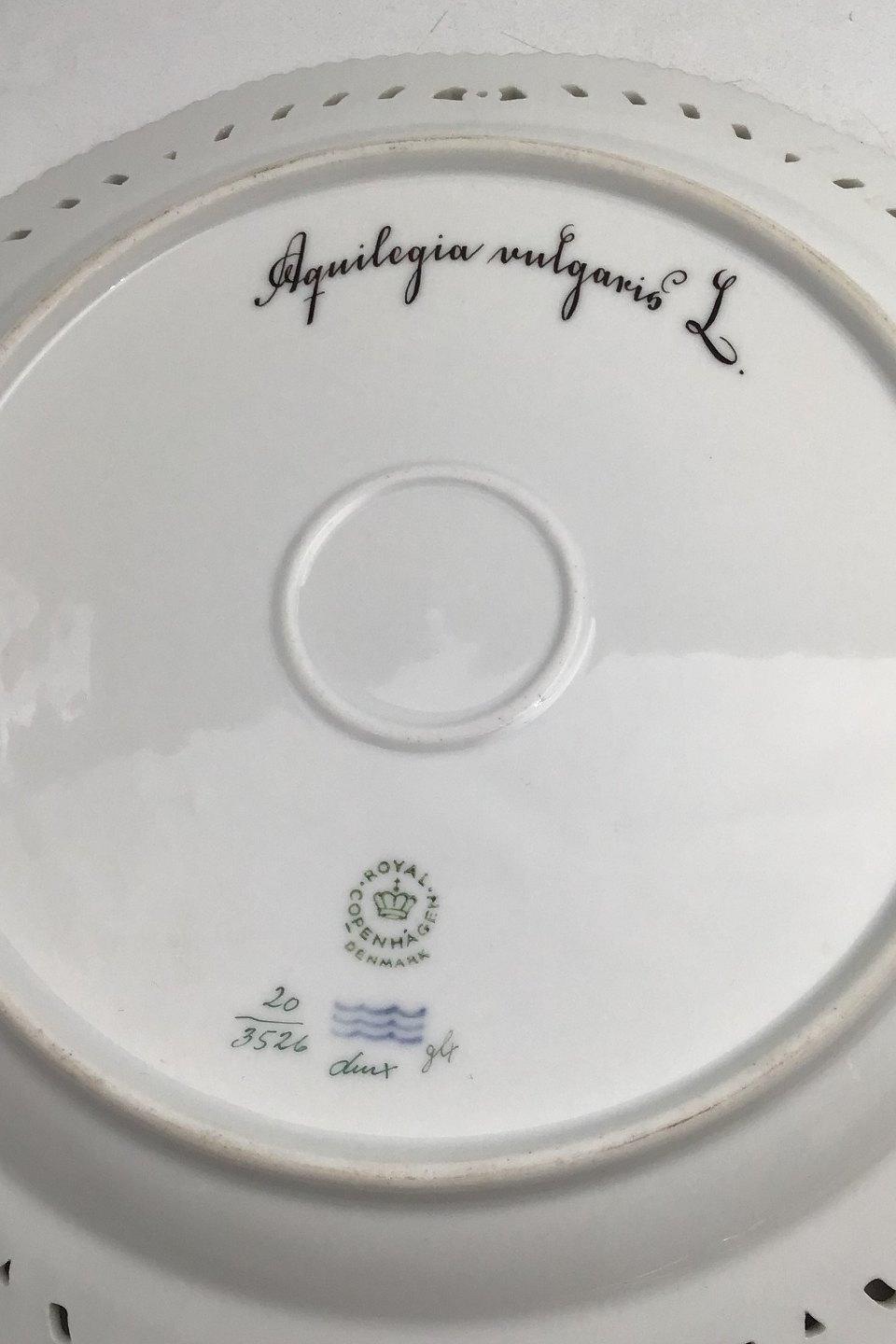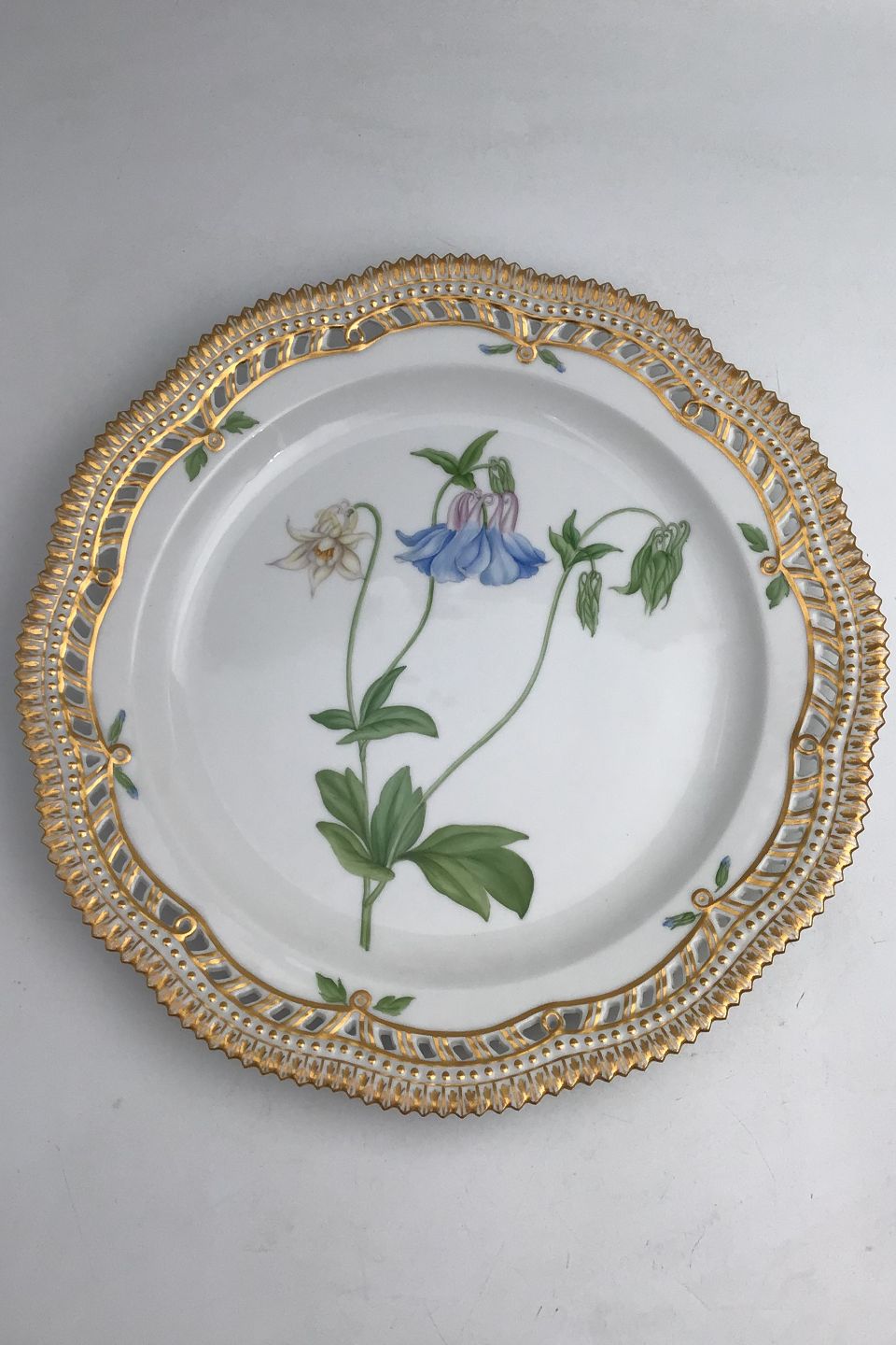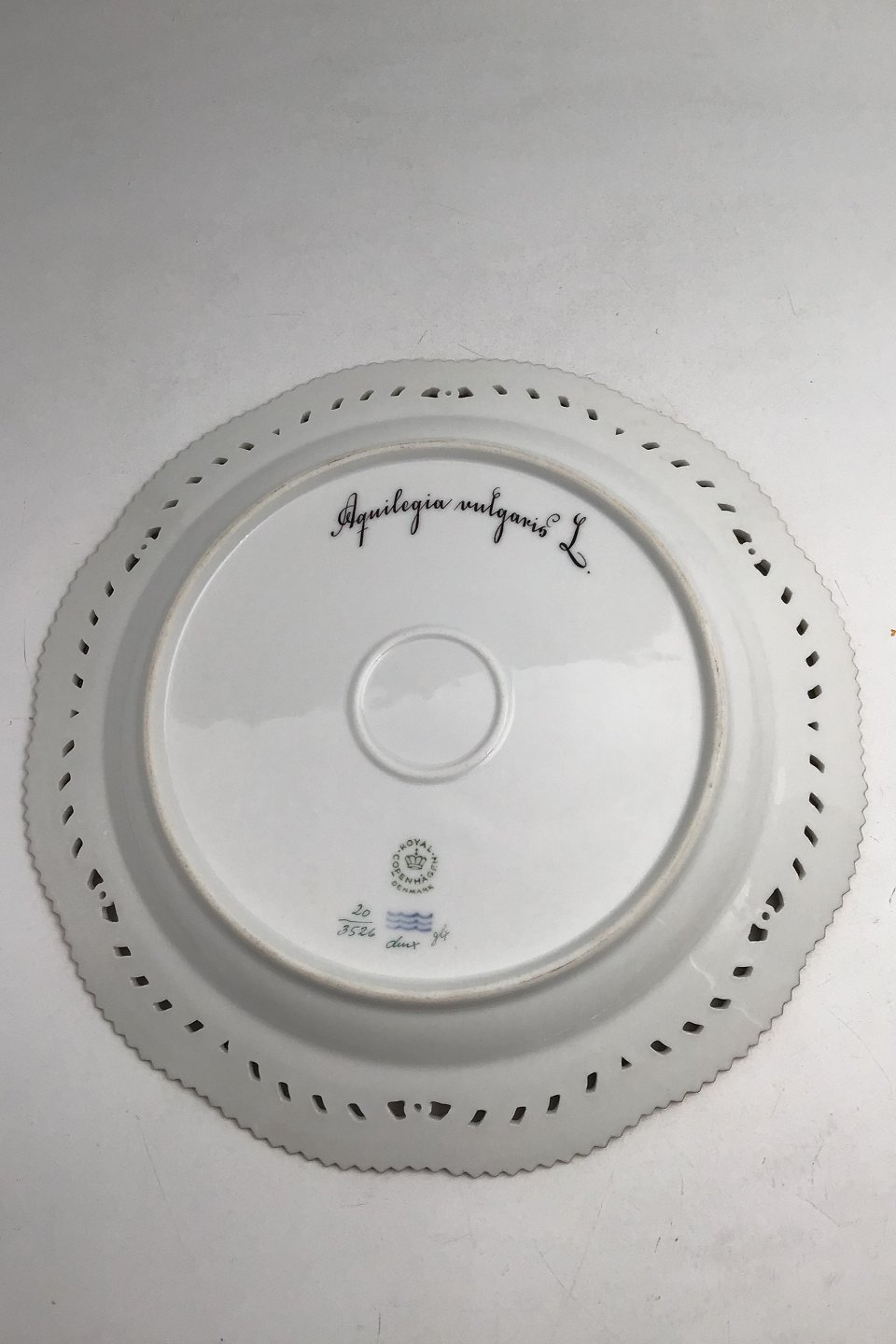 Royal Copenhagen Flora Danica Plate with pierced border No. 20/3526. Measures 27cm / 10.63 inch. 1st Quality Latin name: Aquilegia vulgaris L.