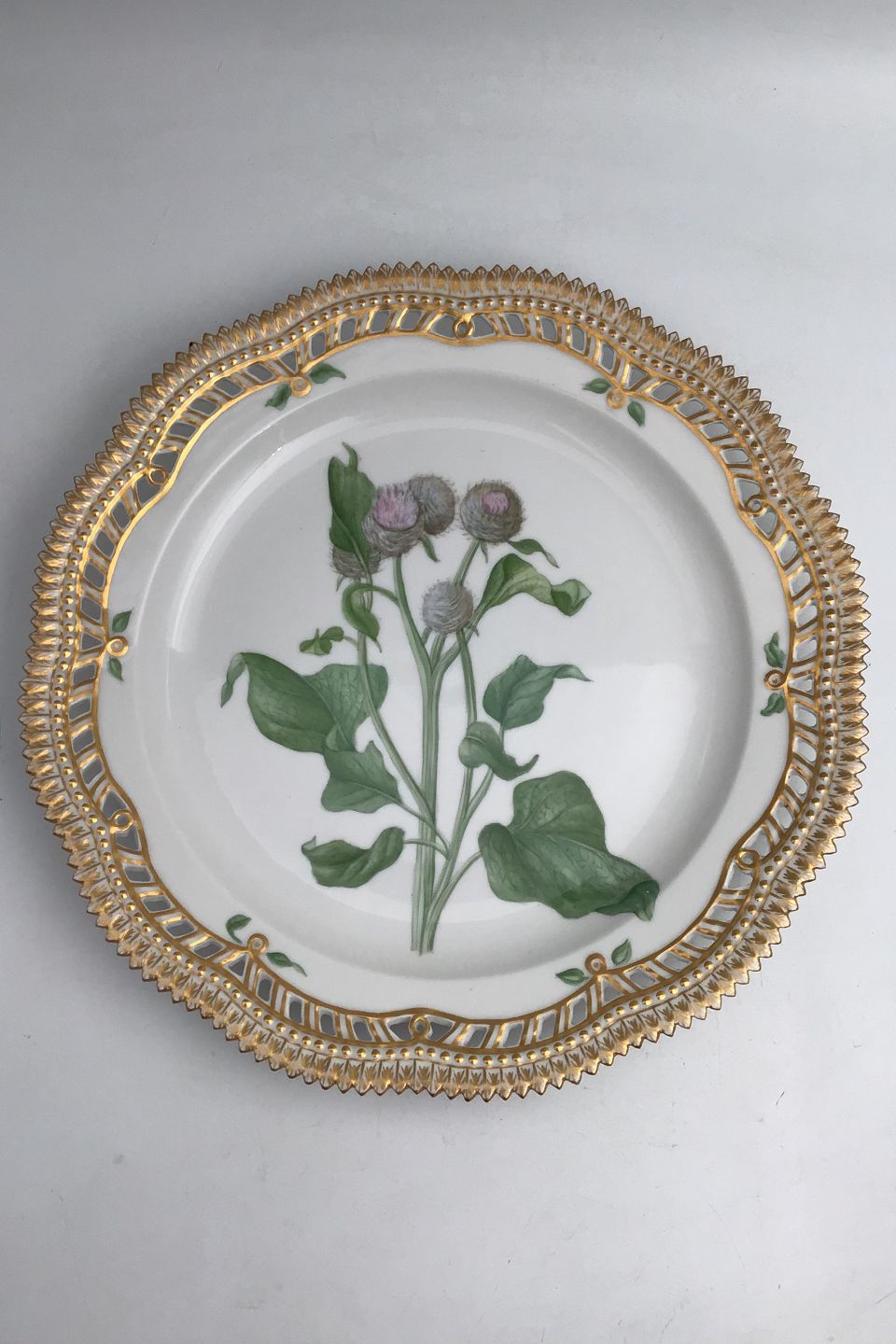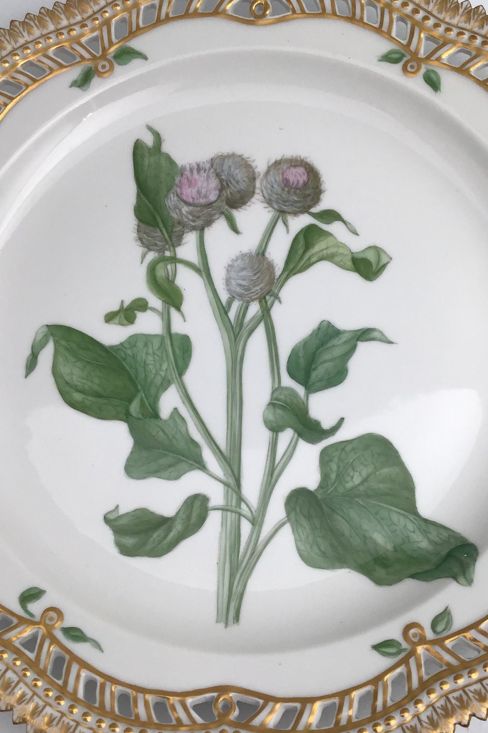 Royal Copenhagen Flora Danica Plate with pierced border No. 20/3526. Measures 27cm / 10.63 inch. 1st Quality Latin name: Lappa tomentosa Lam