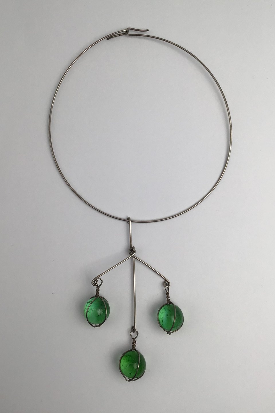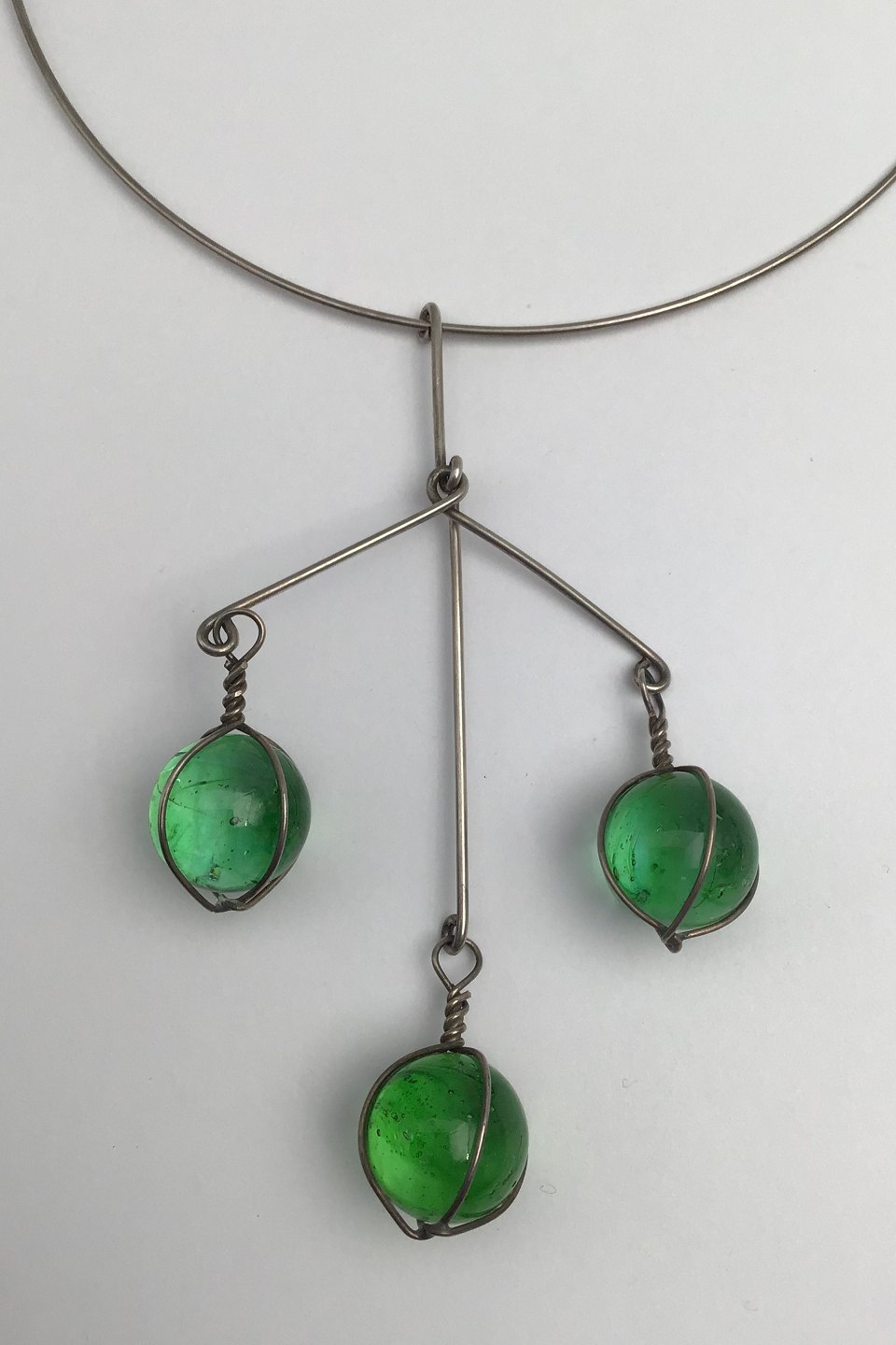 Bent Knudsen Sterling Silver Neck Ring with Pendant (Green Glas Spheres)